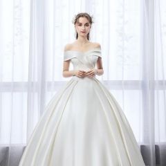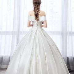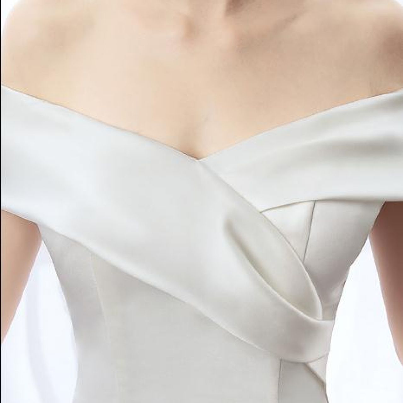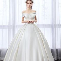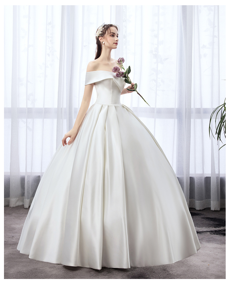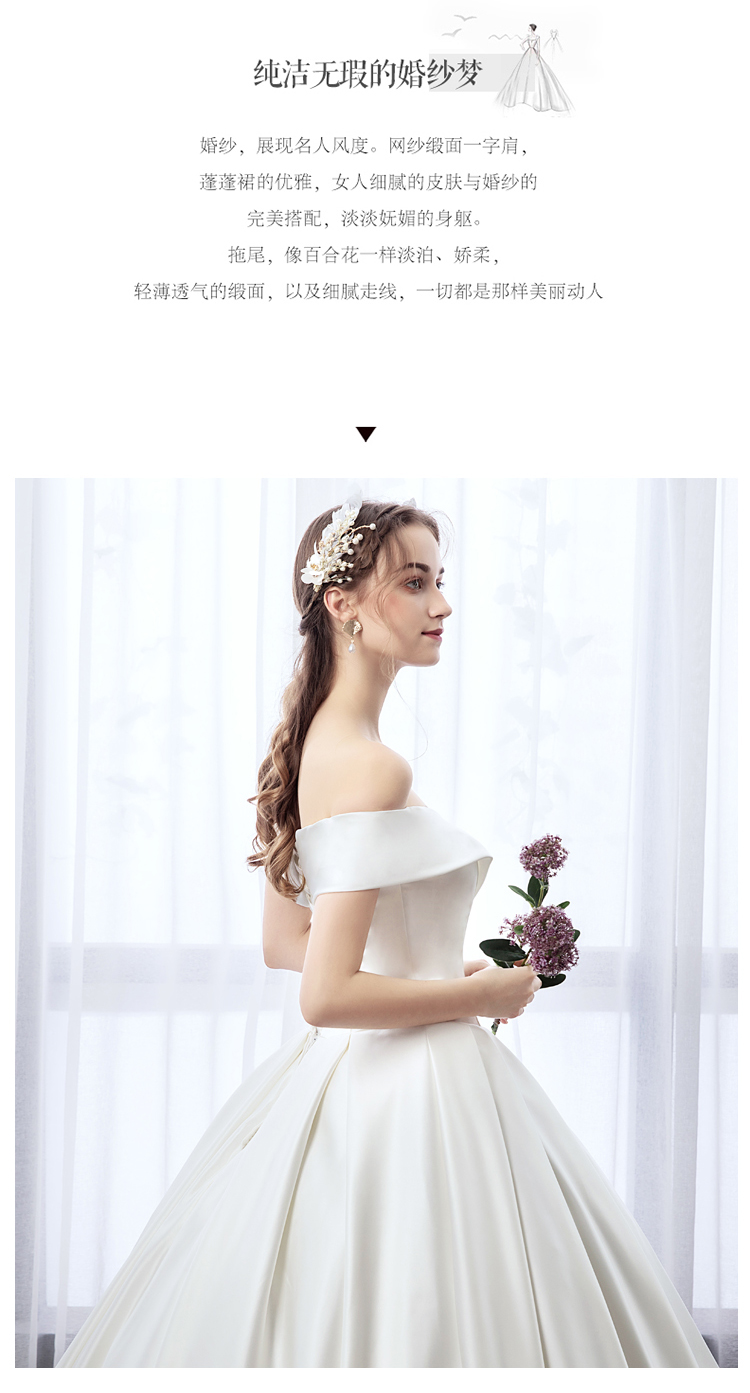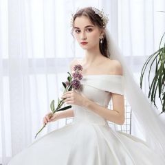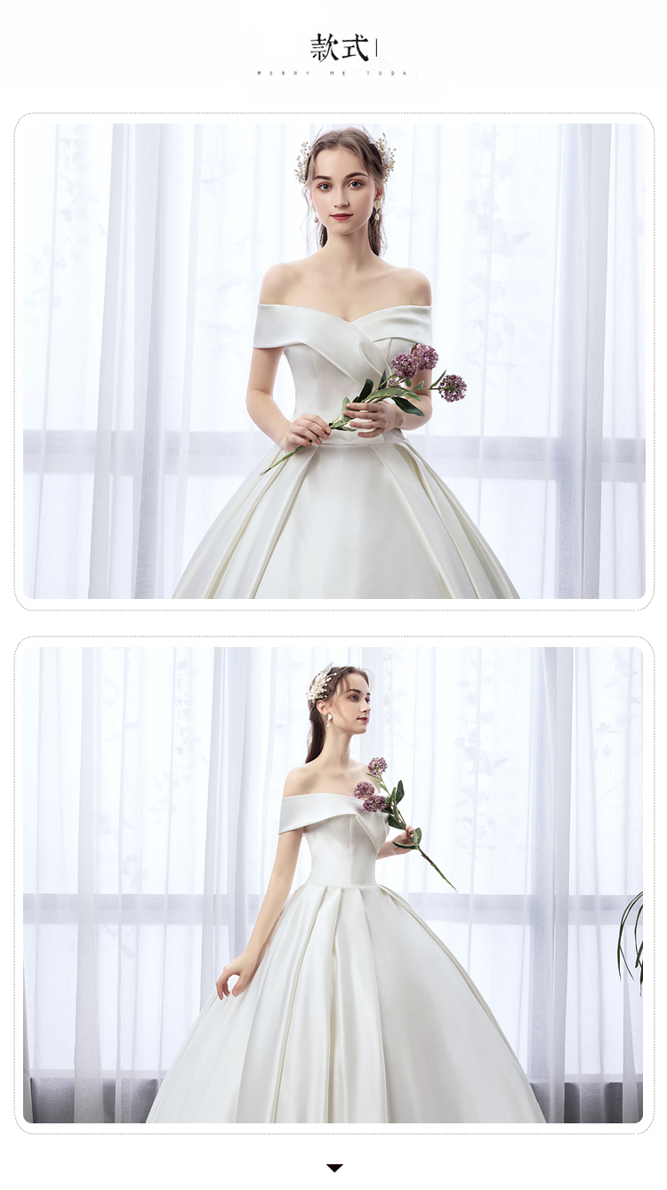 婚纱礼服2020新款新娘森系一字肩气质简约缎面拖尾显瘦赫本宫廷