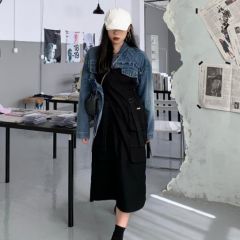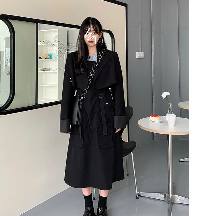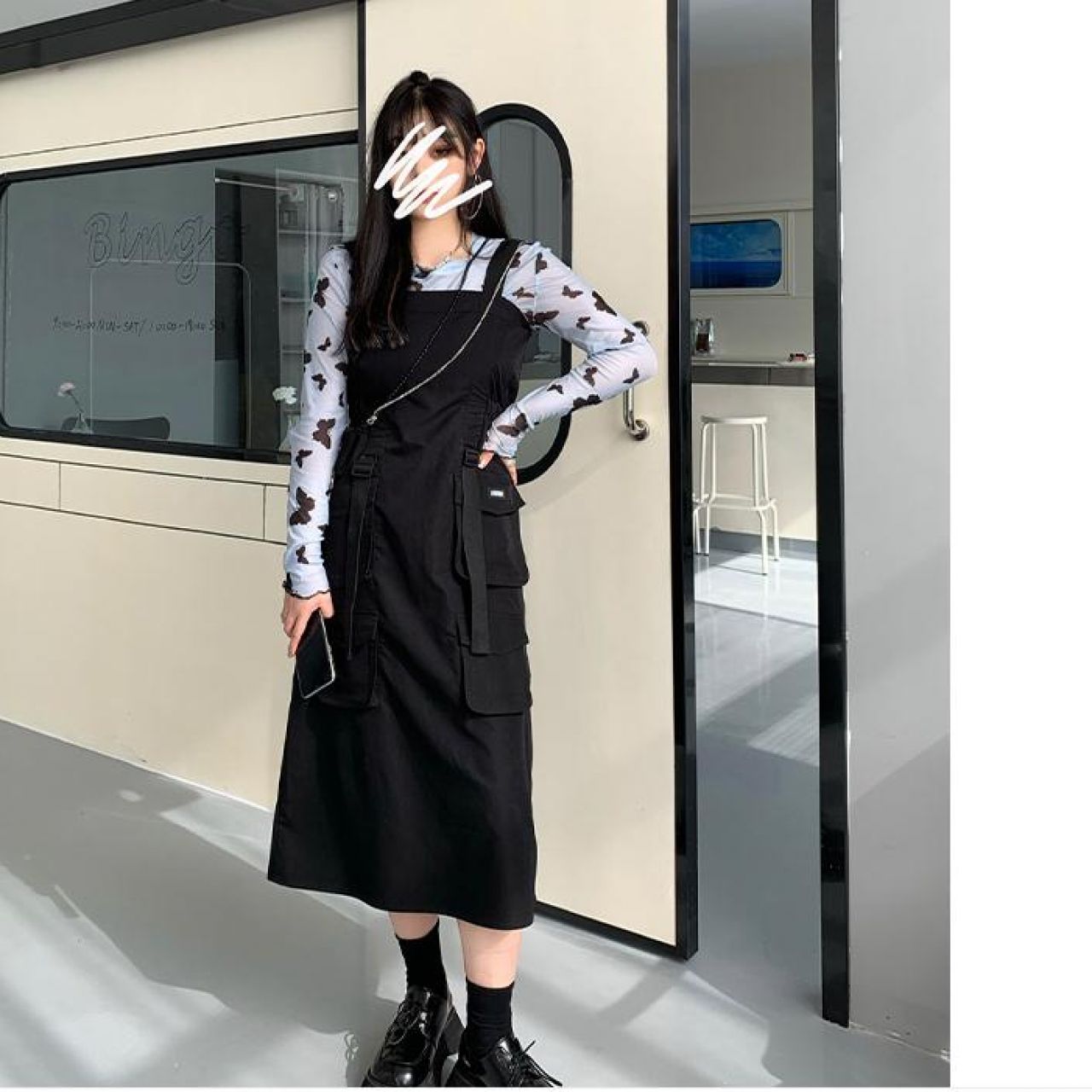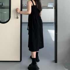 黑泽玄七微胖mm暗黑机车风抽绳巨显瘦吊带黑色连衣裙松紧腰大码女