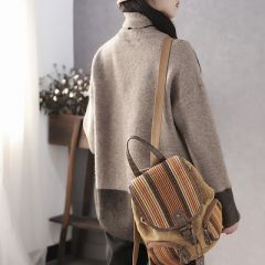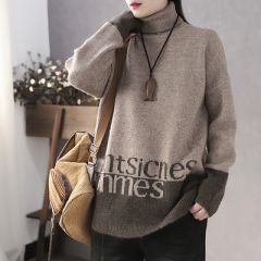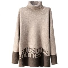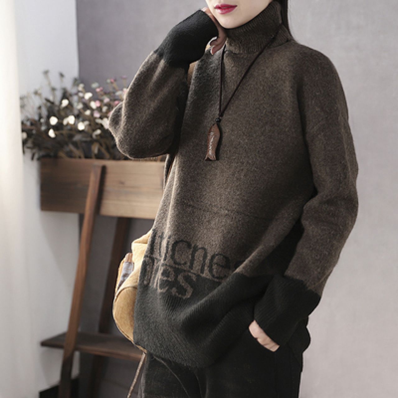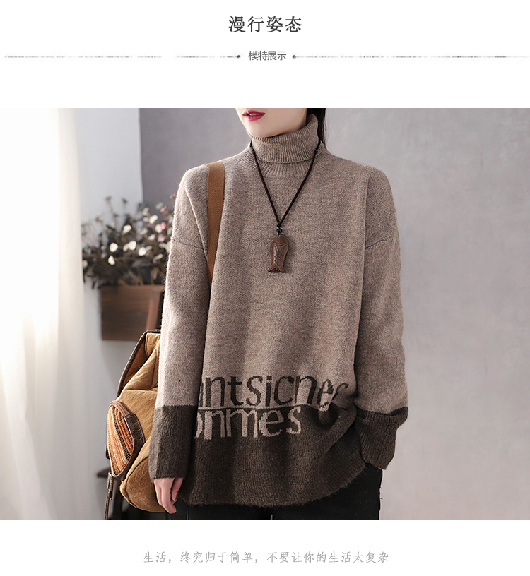 复古冬季高领毛衣女加厚打底衫宽松套头慵懒风拼色针织衫 灰 卡其色 咖啡色 均码