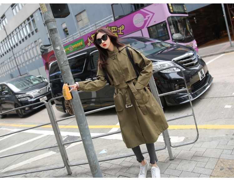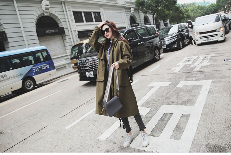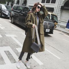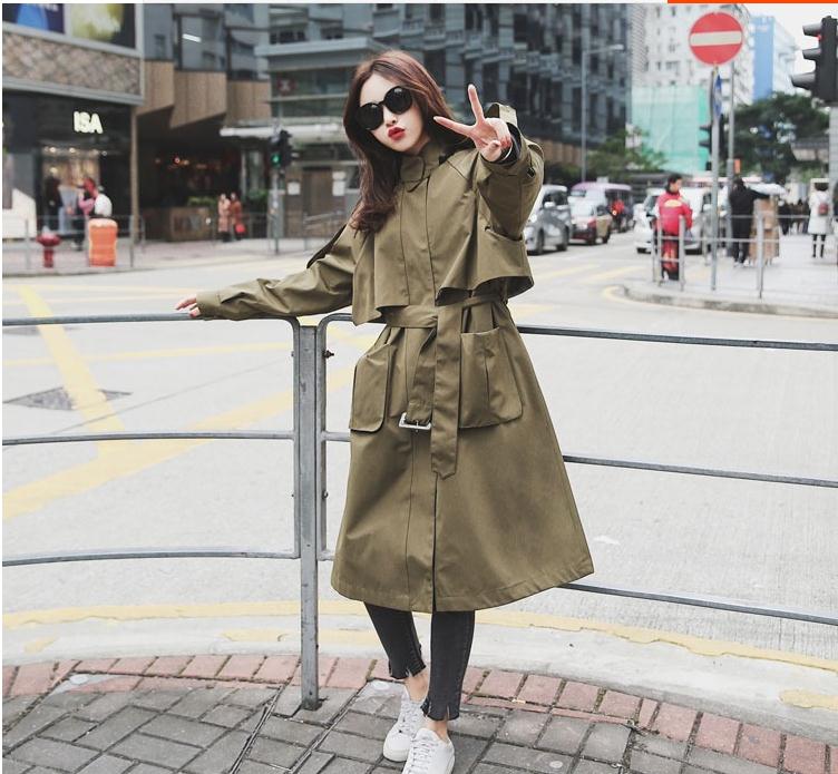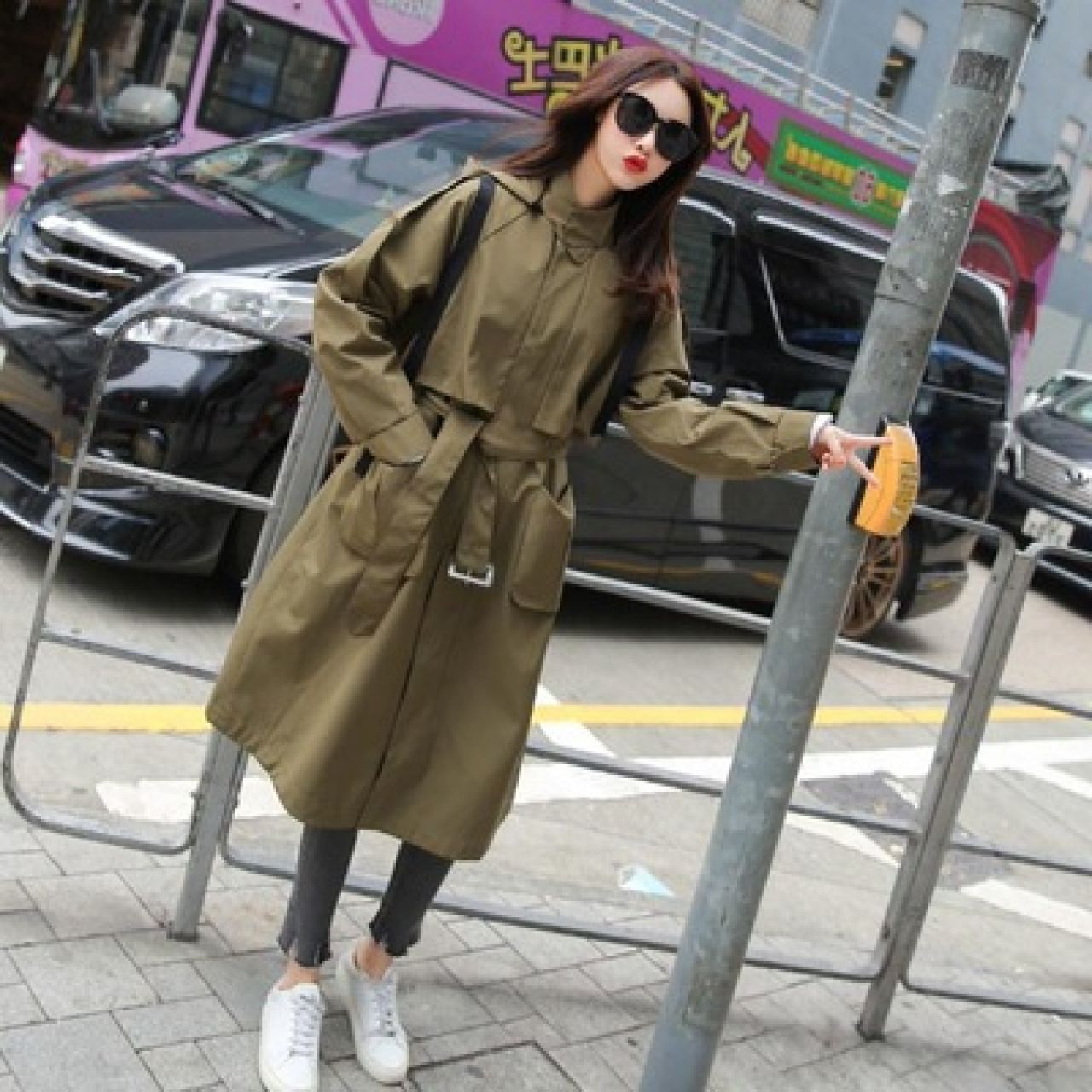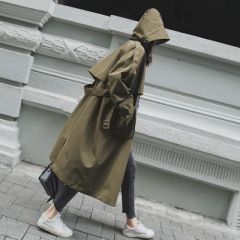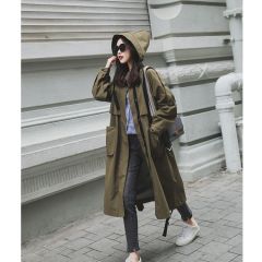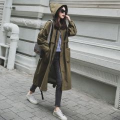 2020秋冬季新中长款女风衣军绿系带连帽工装宽松简约通勤收腰