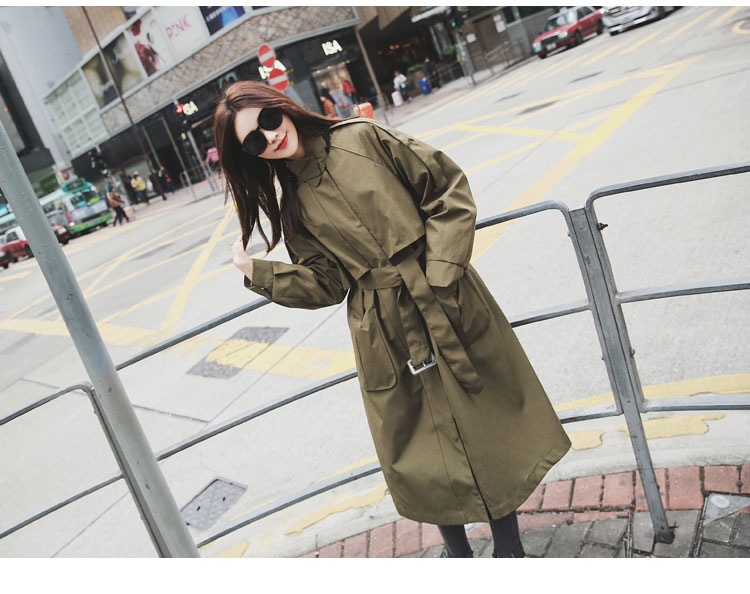 2020秋冬季新中长款女风衣军绿系带连帽工装宽松简约通勤收腰外套