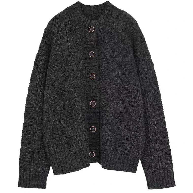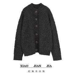 2020秋冬季新款长袖低圆领纯色复古法式宽松麻花毛衣针织开衫外套