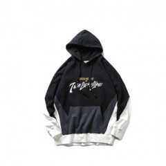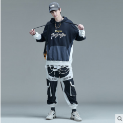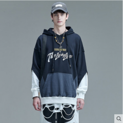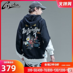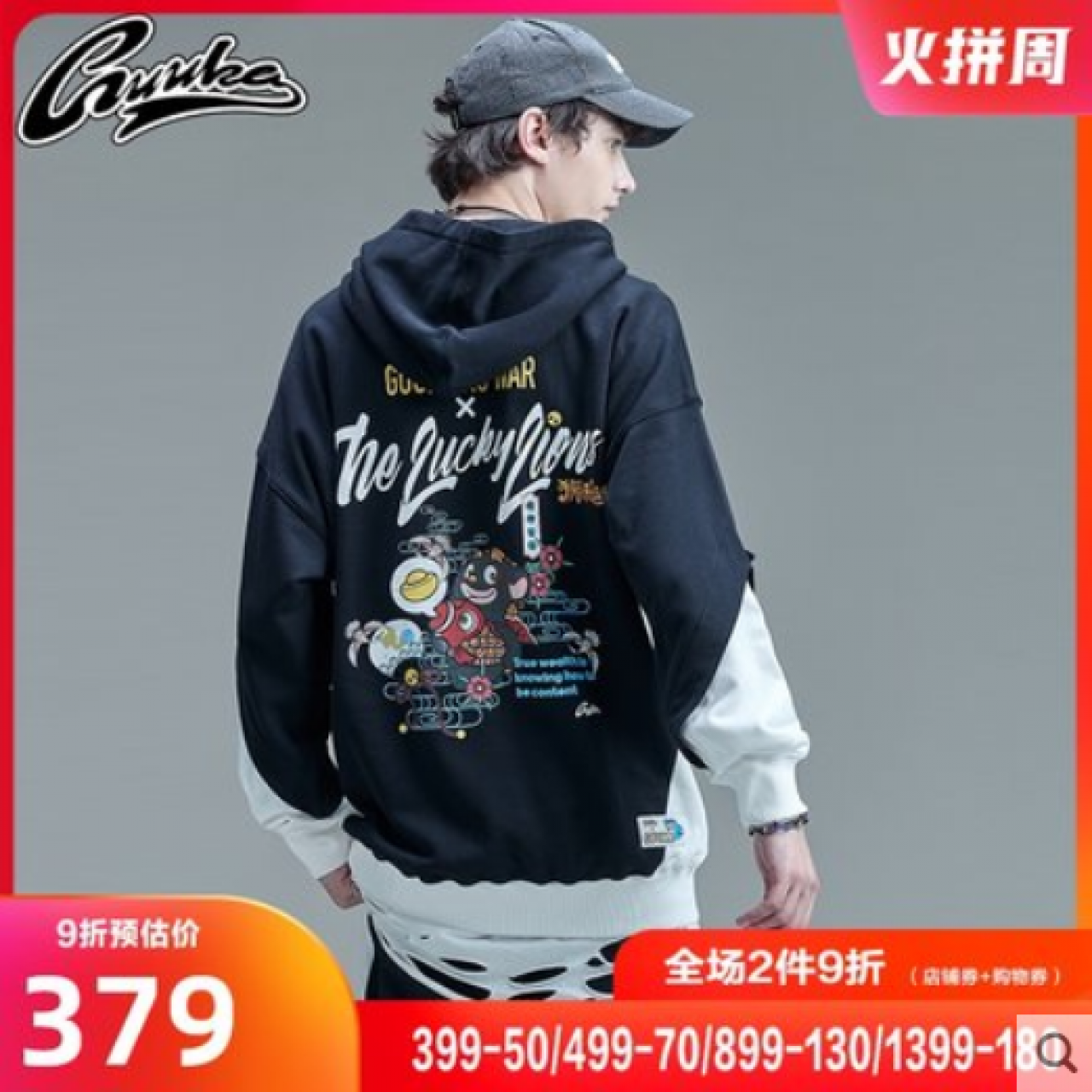 GUUKA&狮来运转联名潮牌假两件卫衣男连帽嘻哈刺绣运动长帽衫宽松
