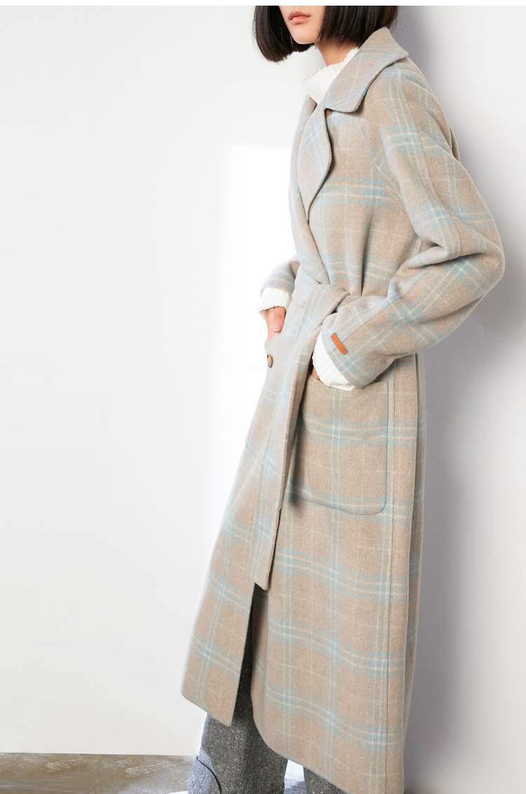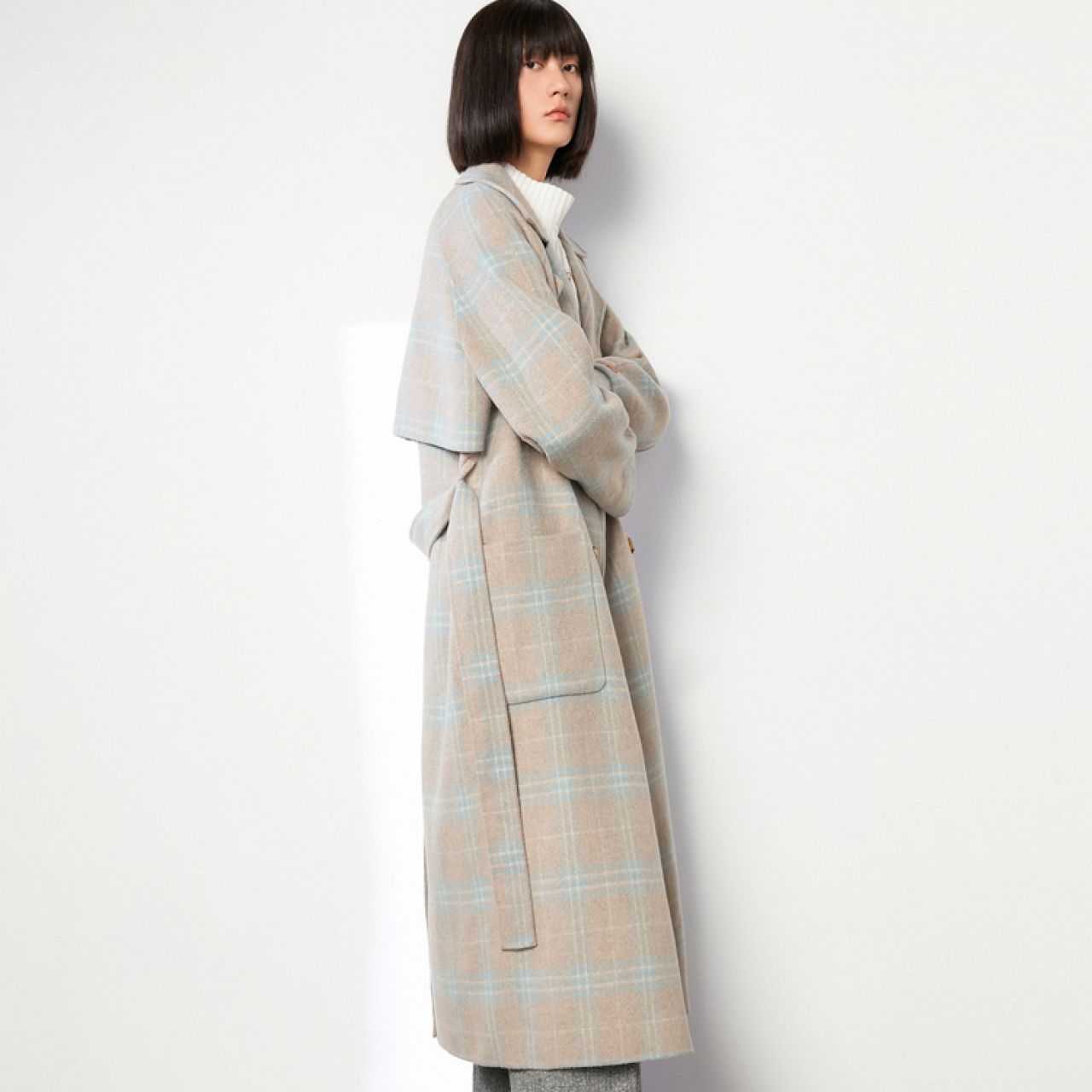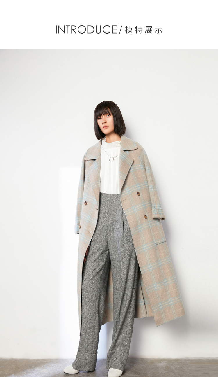 LILY2019冬新款大格纹长款双面呢羊毛翻领毛呢外套