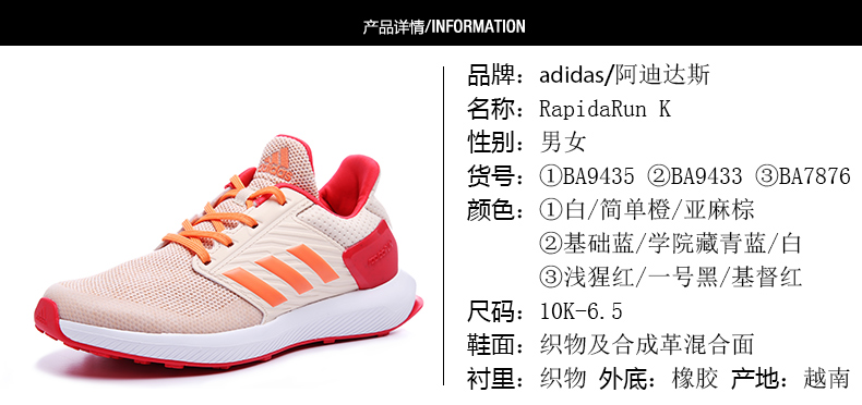 运动鞋分类: 跑步鞋 适用性别: 女 男 中性 颜色分类: BA9433蓝色 BA9435 存款稍有瑕疵 亏本清仓 货号: BA9433 BA9435 适用季节: 不限季节 上市年份季节: 2019年秋季 鞋底材质: 橡胶 配皮材质: 织物