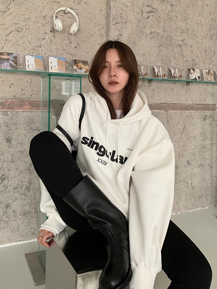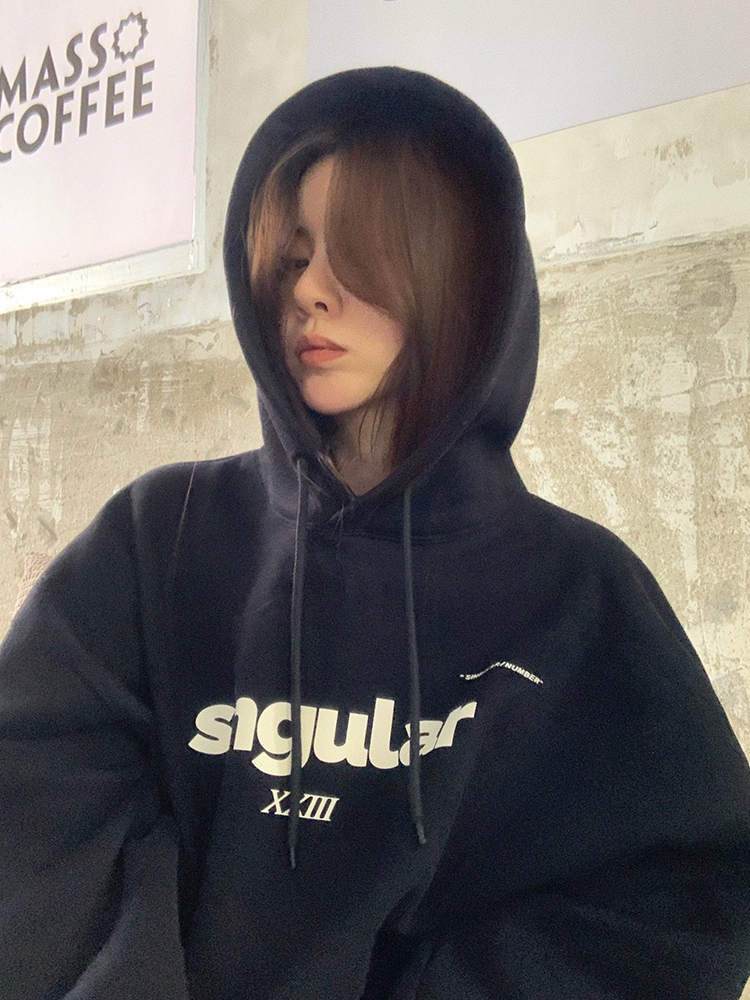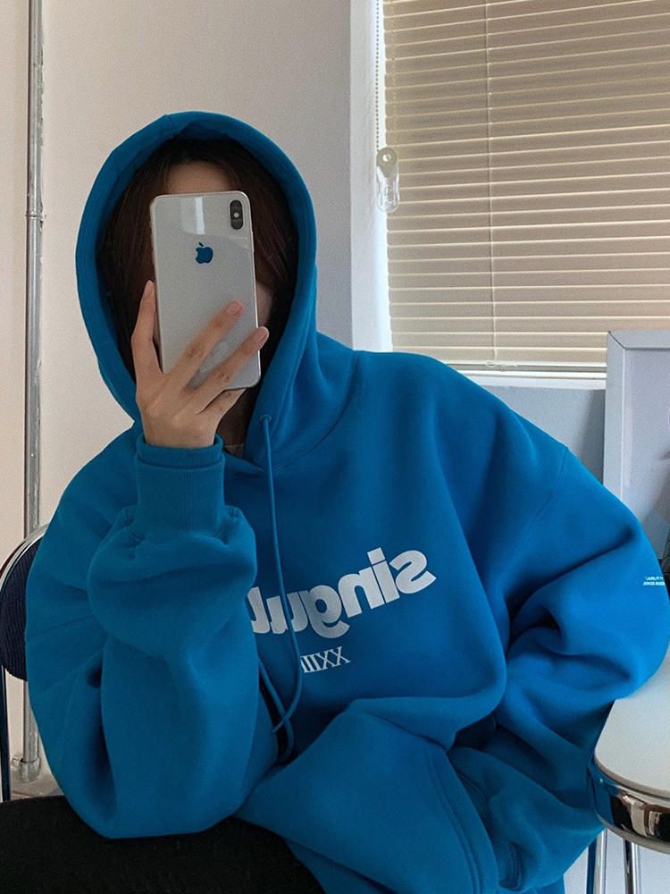 LIL CHER灰色连帽卫衣女加绒加厚2020新款秋冬宽松韩版慵懒风上衣