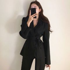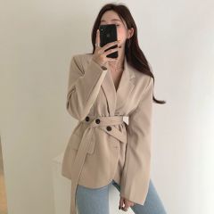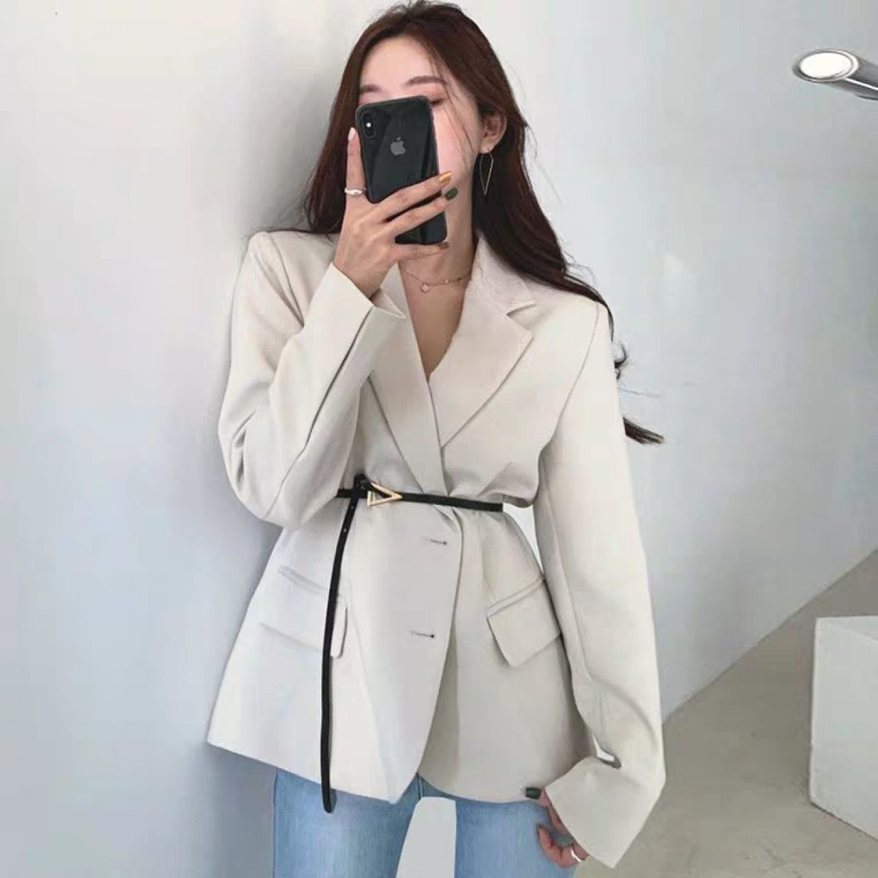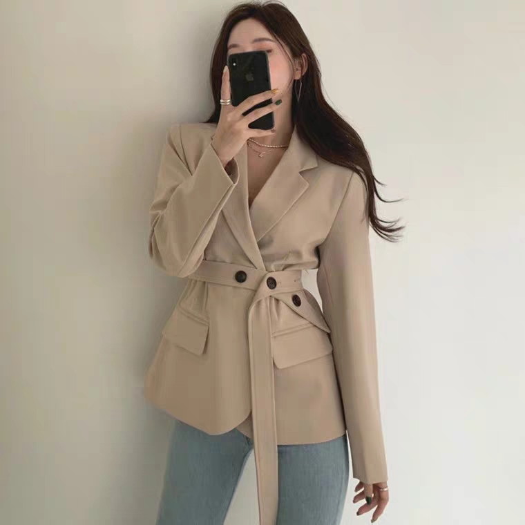韩国chic法式优雅翻领单排扣设计修身收腰长袖西装短外套配腰带女
