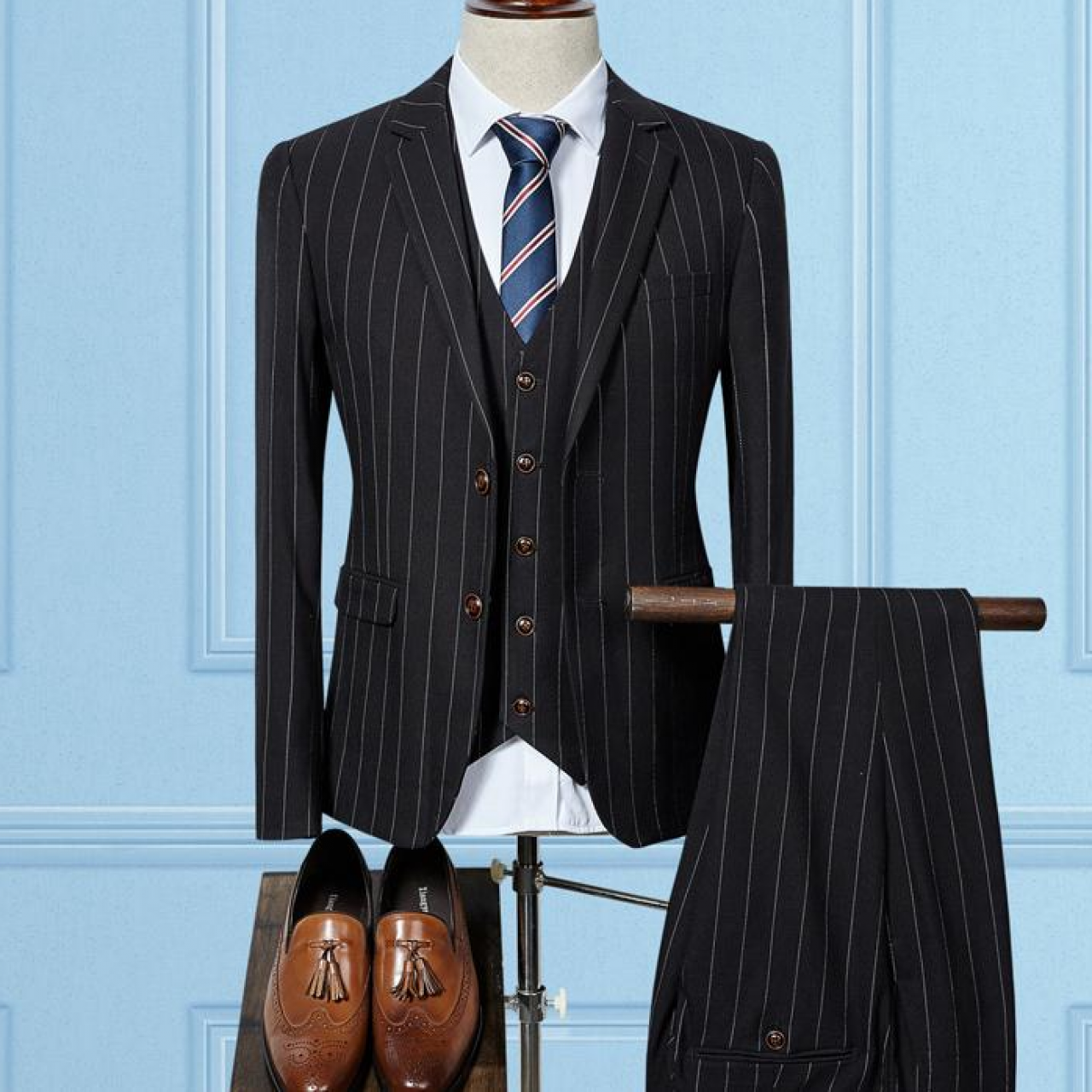 潮流韩版修身气质条纹双排扣西服套装男发型师新郎结婚西装三件套