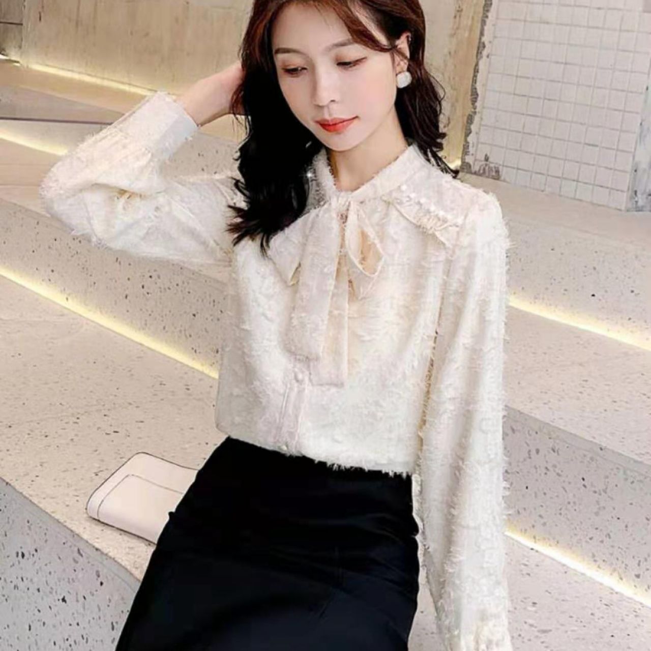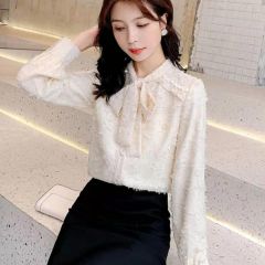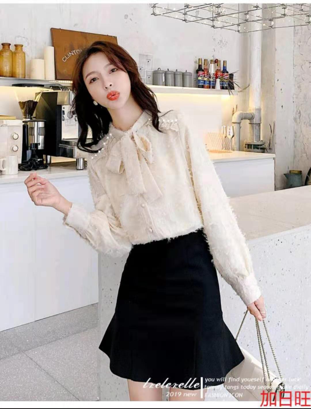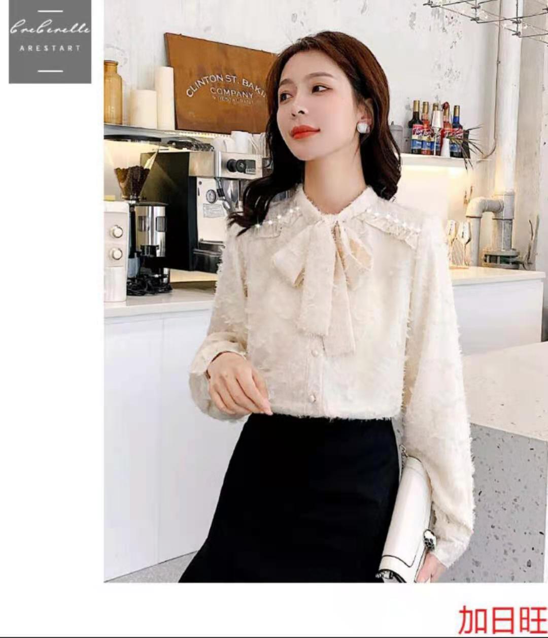 时尚流行秋冬打底加绒加厚寸衫女2020年新款洋气蝴蝶结钉珠蕾丝雪纺衫