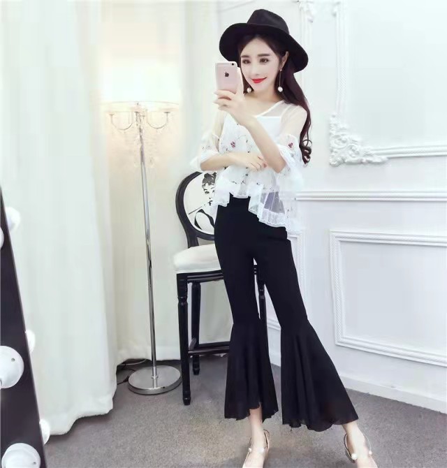 蔚缇2017夏季小花网纱+吊带+喇叭裤三件套女