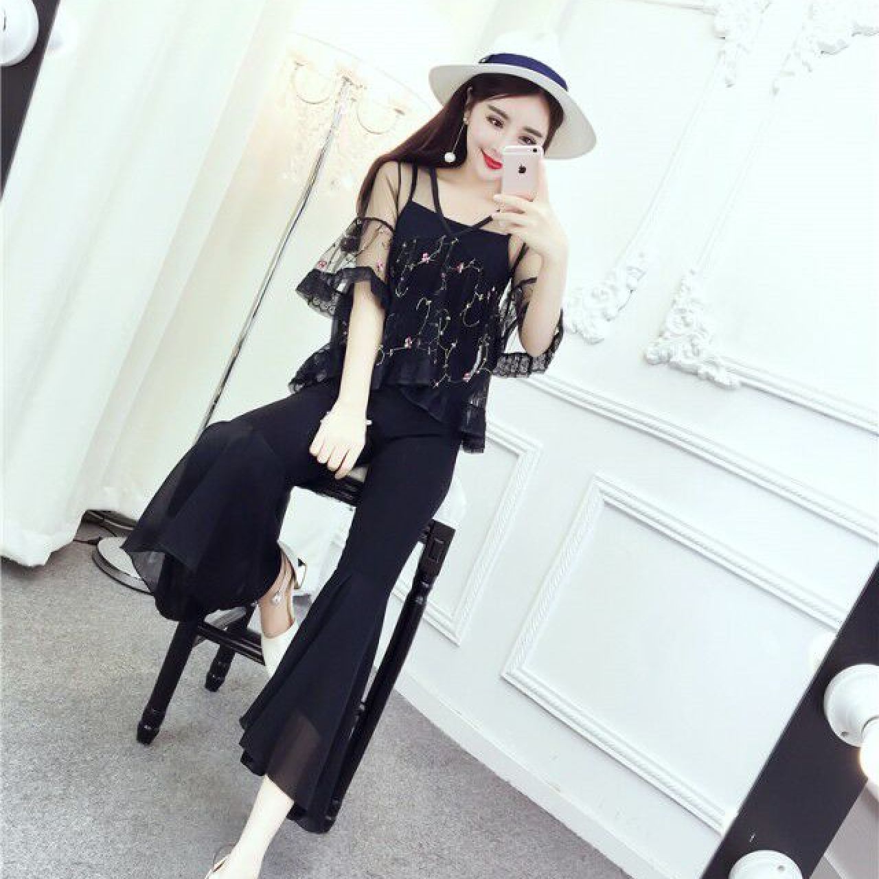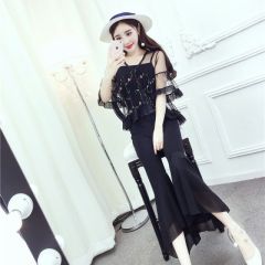 蔚缇2017夏季小花网纱+吊带+喇叭裤三件套女