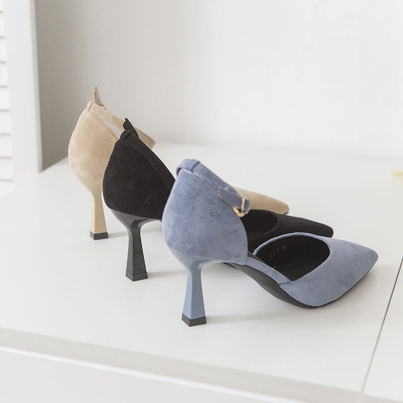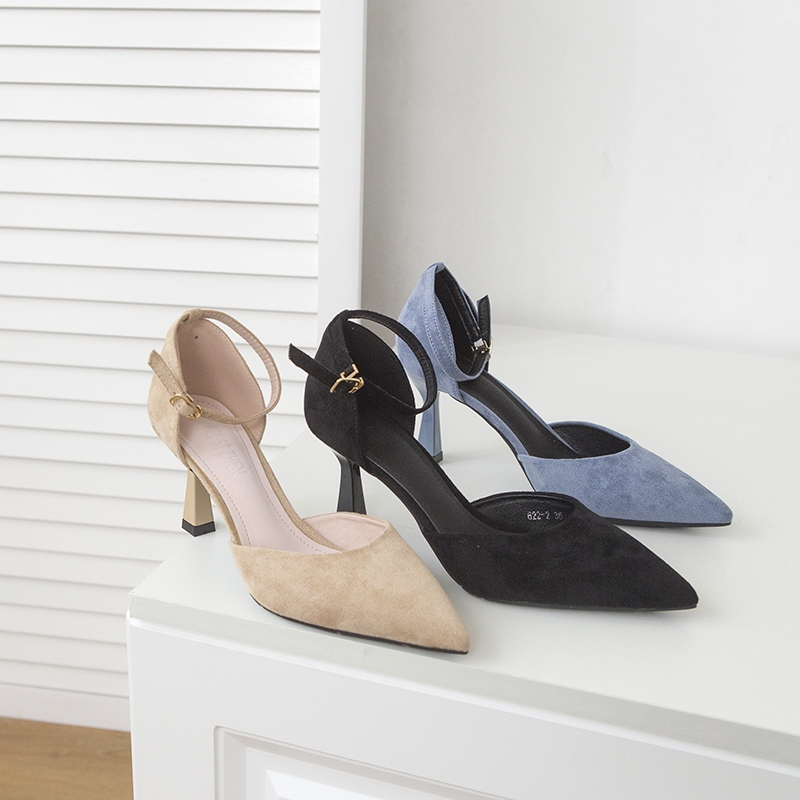 尖头粗跟高跟鞋一字扣单鞋 性感窜珠脚链高跟浅口凉鞋女鞋
