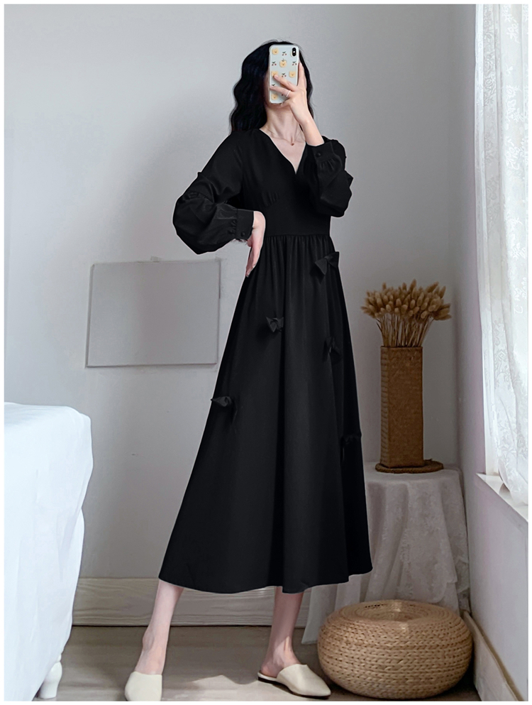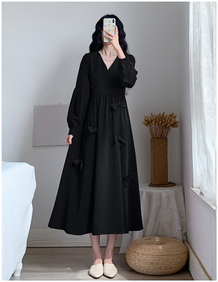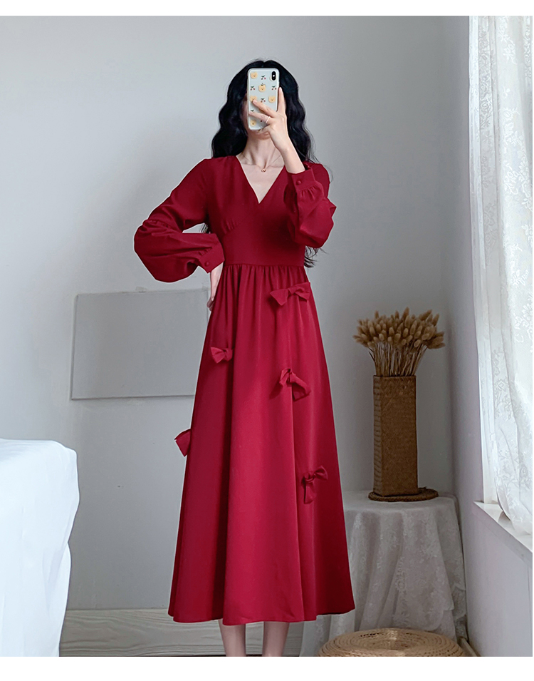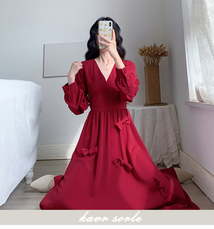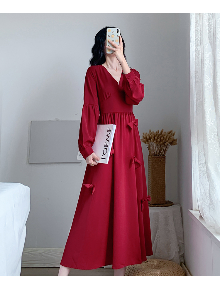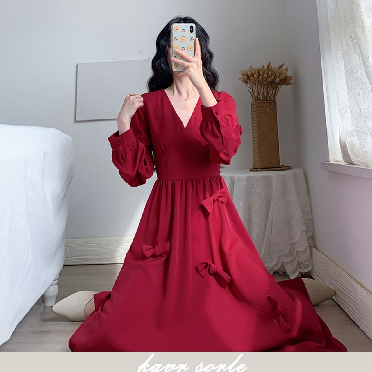 红色长袖连衣裙女2020新款春秋复古收腰显瘦长款气质过膝长裙