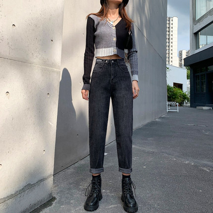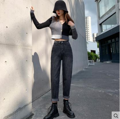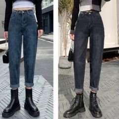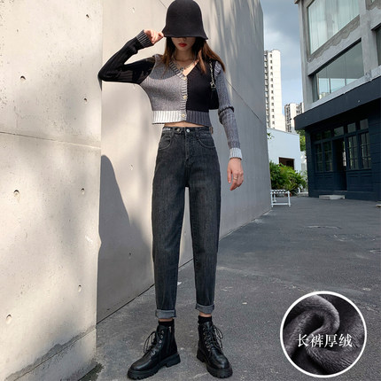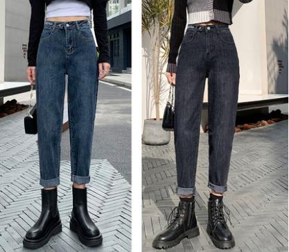 高腰牛仔裤女显瘦配马丁靴弹力阔腿萝卜老爹长裤子宽松直筒加薄绒128