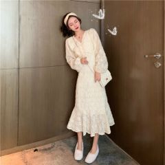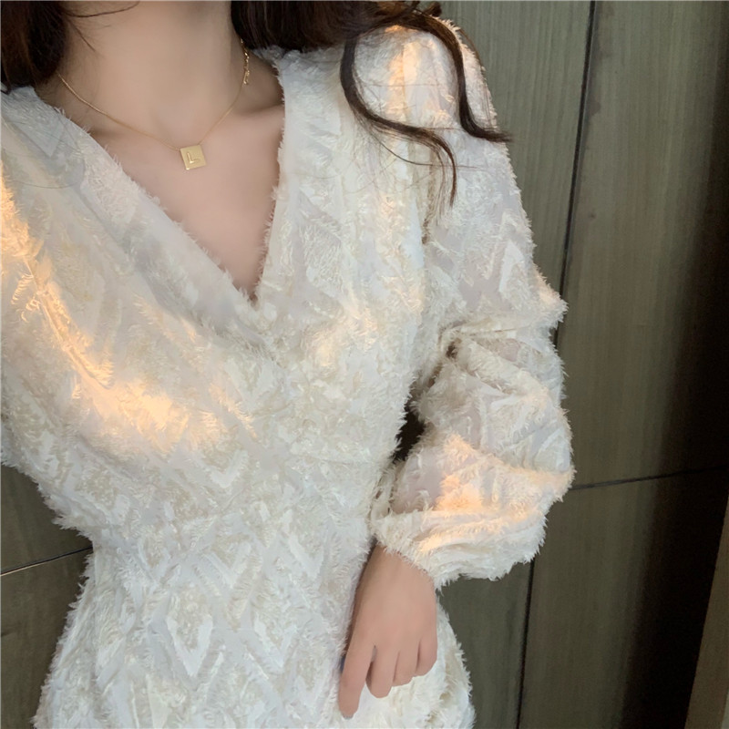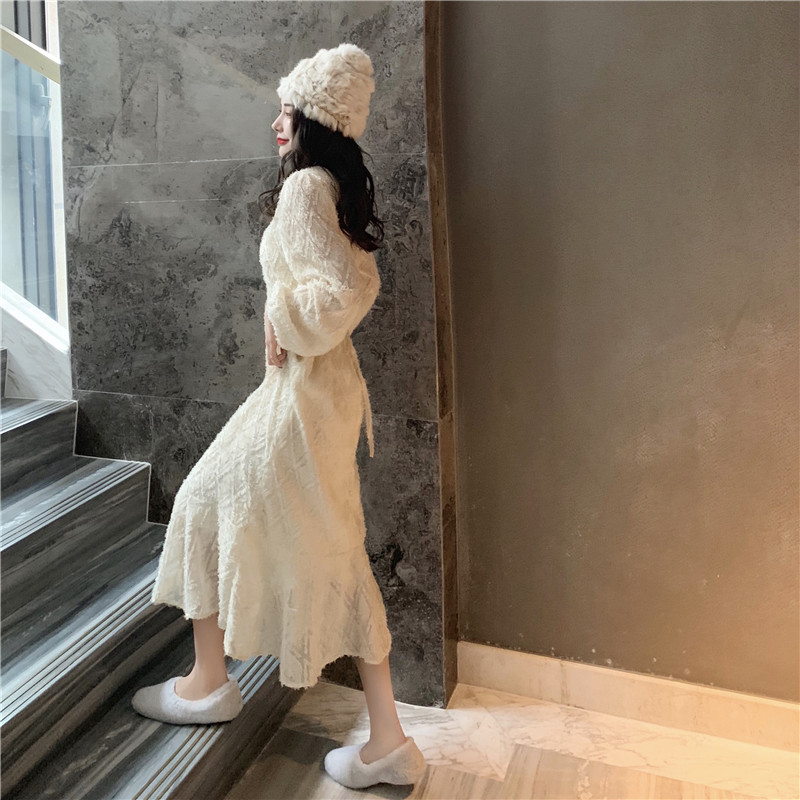 2020年新款法式复古桔梗白色连衣裙女秋冬小个子显瘦冬季气质裙子