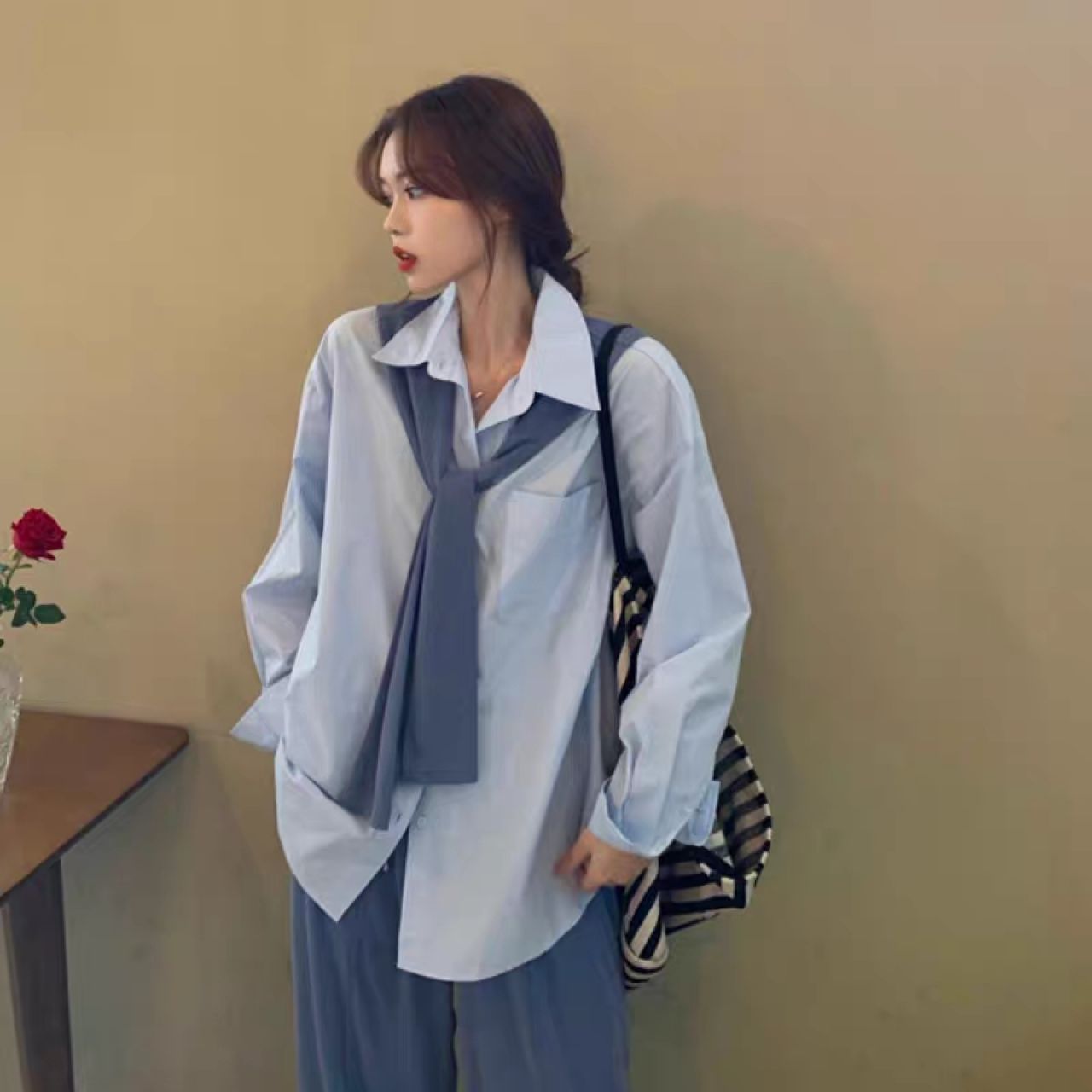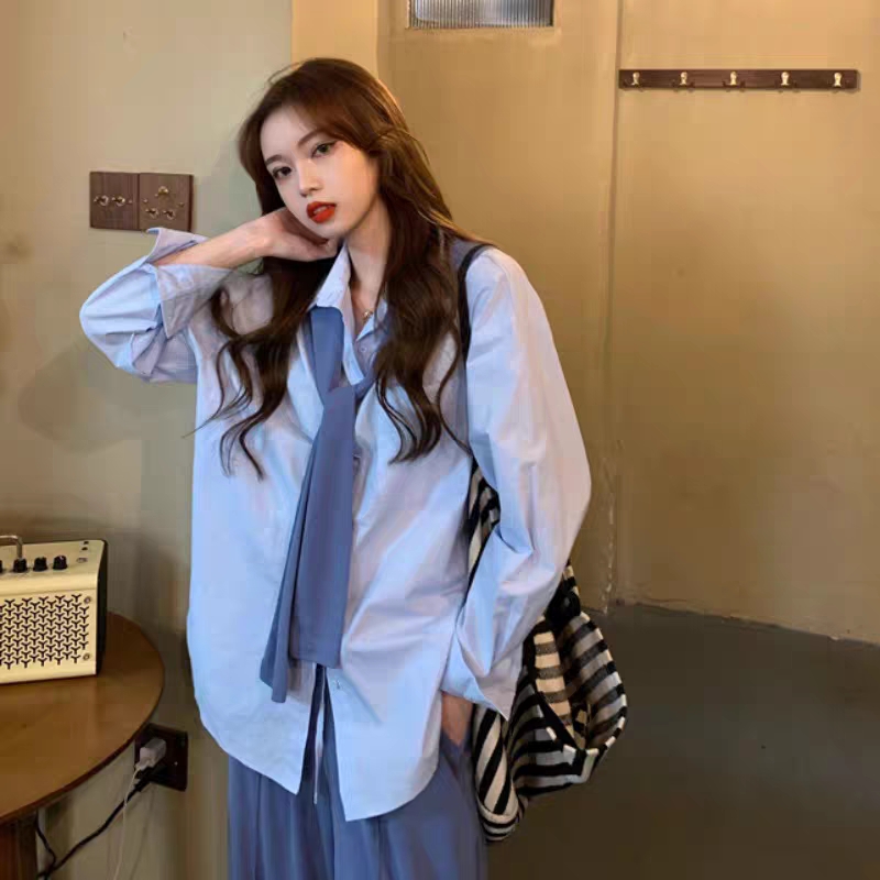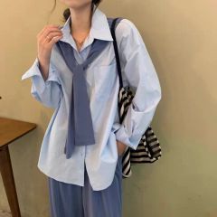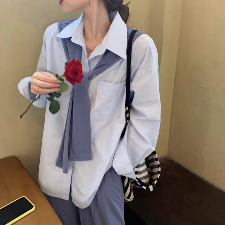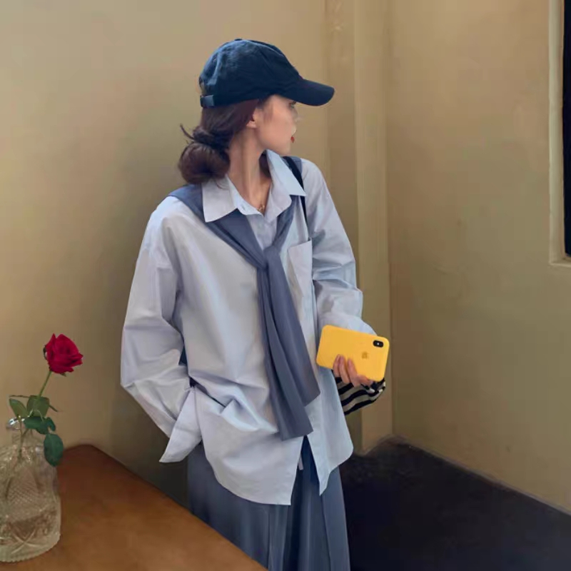 长袖衬衫女秋韩版宽松百搭显瘦设计感小众港风chic休闲上衣配披肩