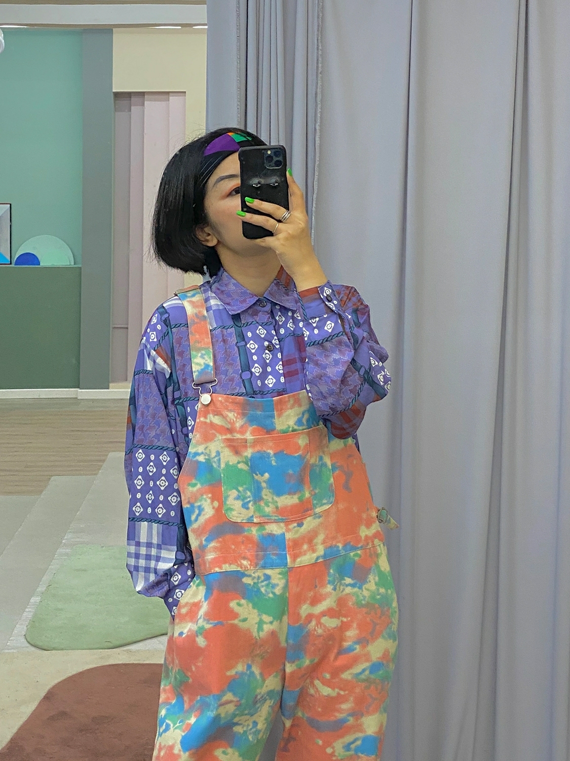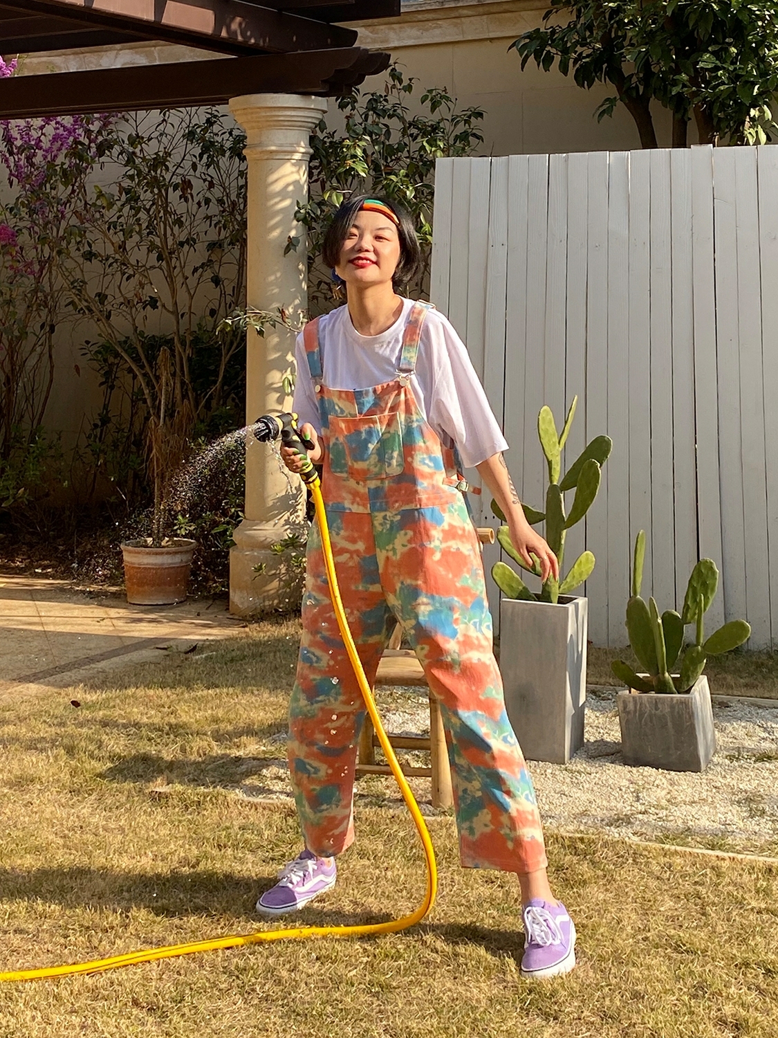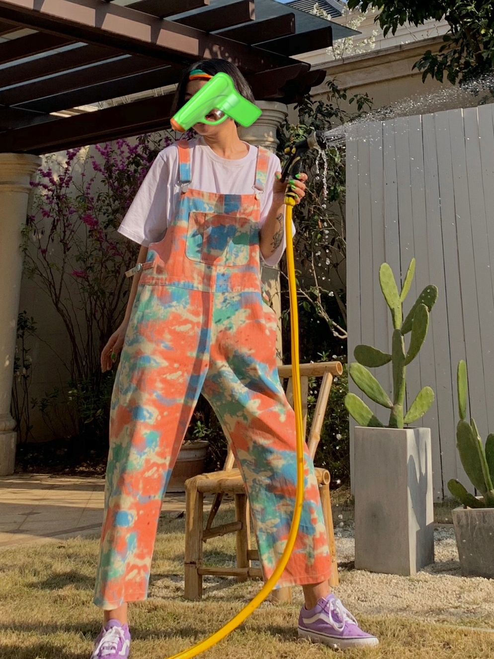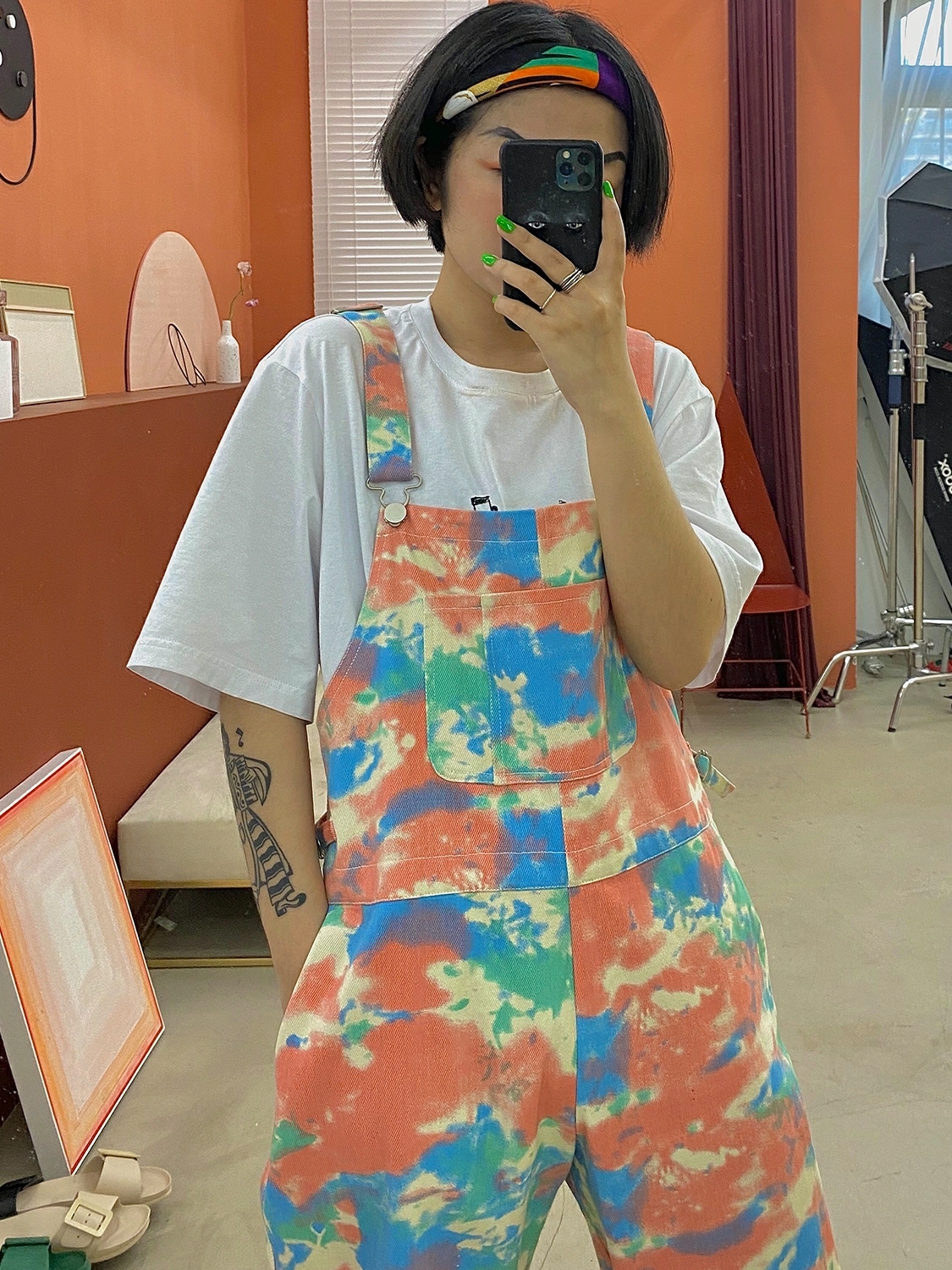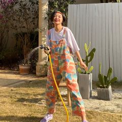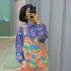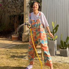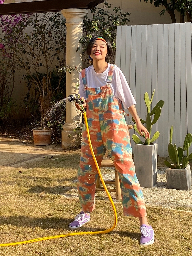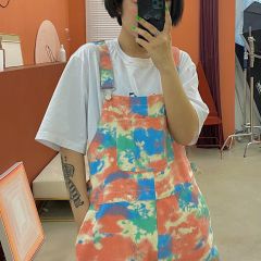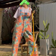 化学少女扎染直筒九分背带裤牛仔裤宽松显瘦裤子