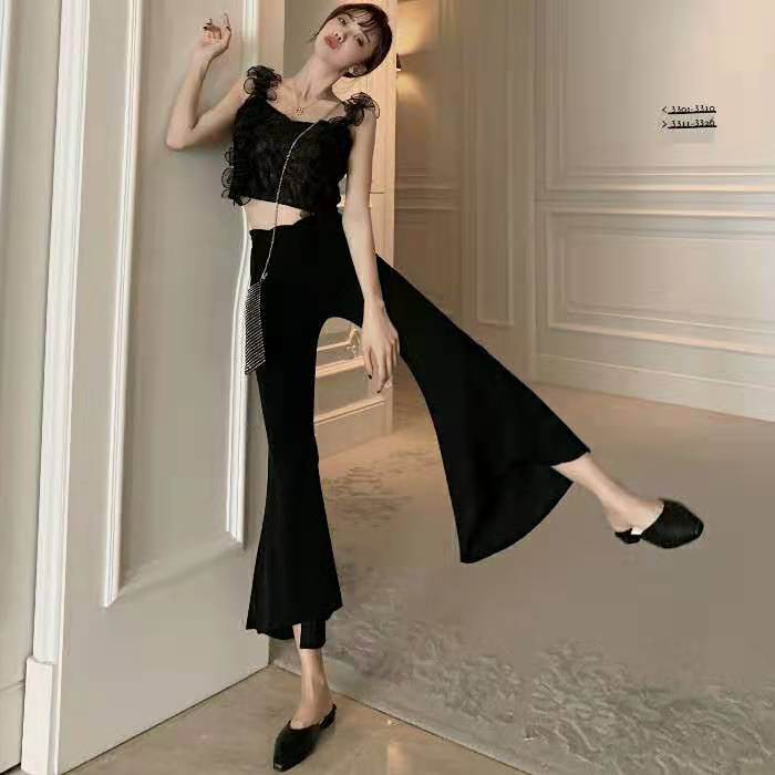 蔚缇2017夏季小花网纱+吊带+喇叭裤三件套女