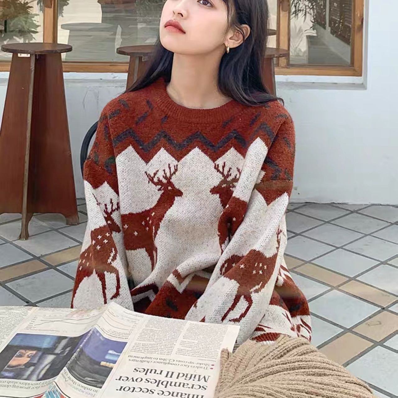 韩版慵懒风ins风麋鹿提花2020冬季新款宽松洋气针织衫圣诞毛衣女