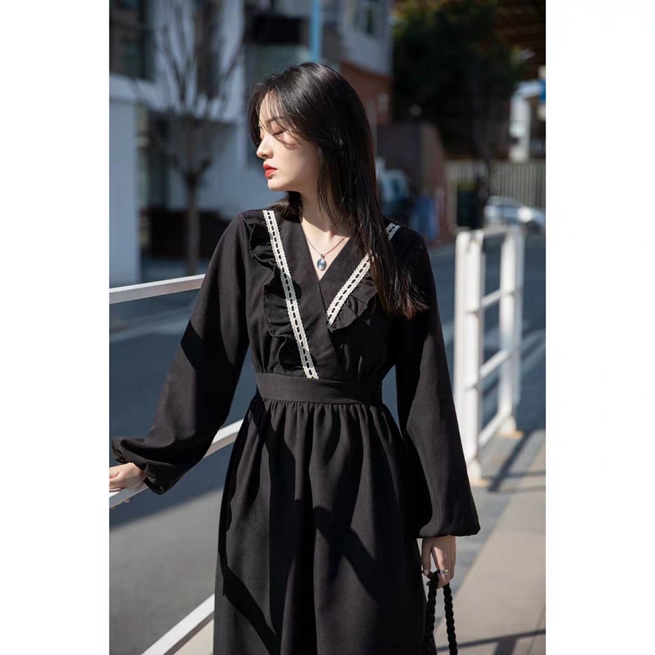 花边V领收腰连衣裙长裙雪纺新款秋冬季2020年新款小个子法式连衣裙气质小众收腰显瘦中长款裙子女
