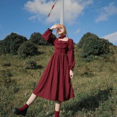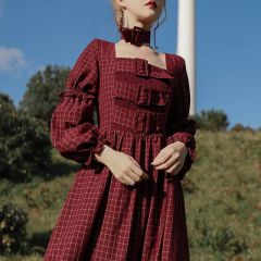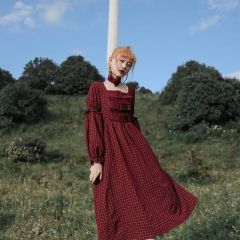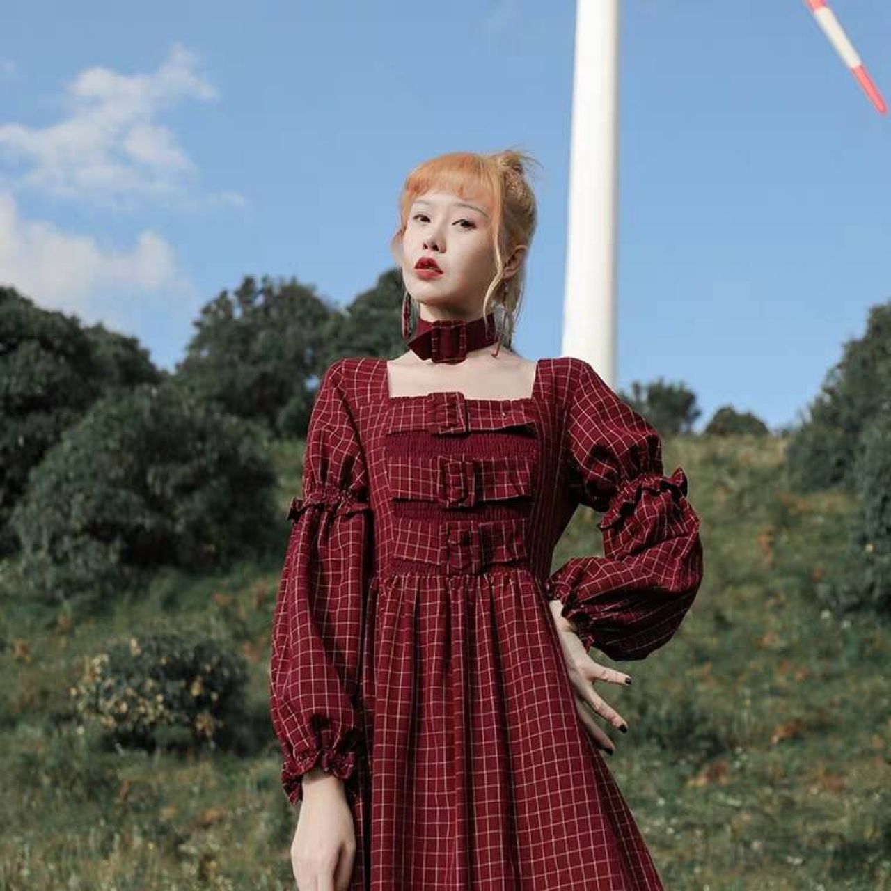 首页> 男装/ 女装/ 内衣> 女装> 一字肩连衣裙> 芝士日【血色童话】暗红格子连衣裙甜酷方领在逃公主裙长裙