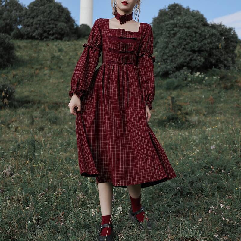 芝士日【血色童话】暗红格子连衣裙甜酷方领在逃公主裙长裙