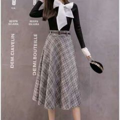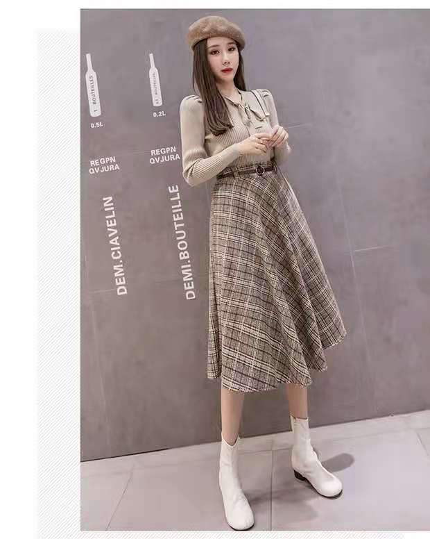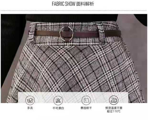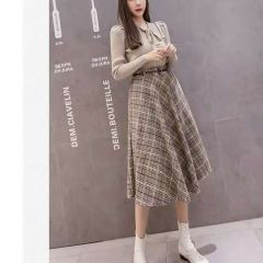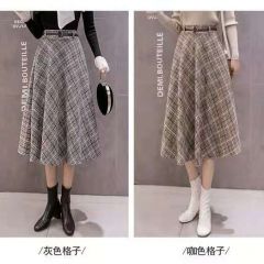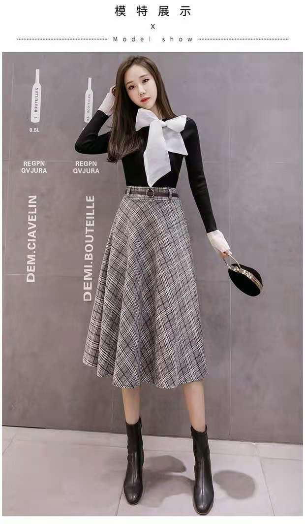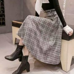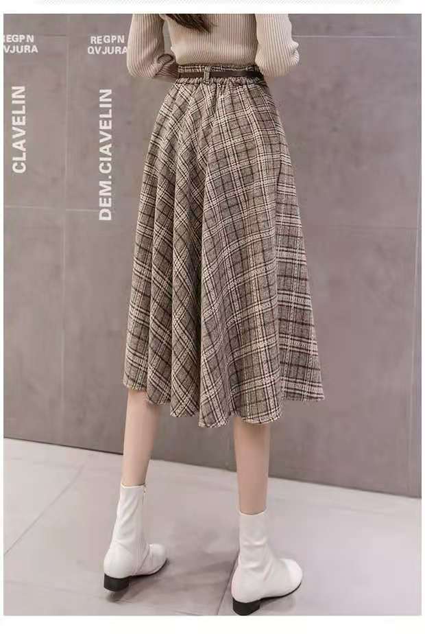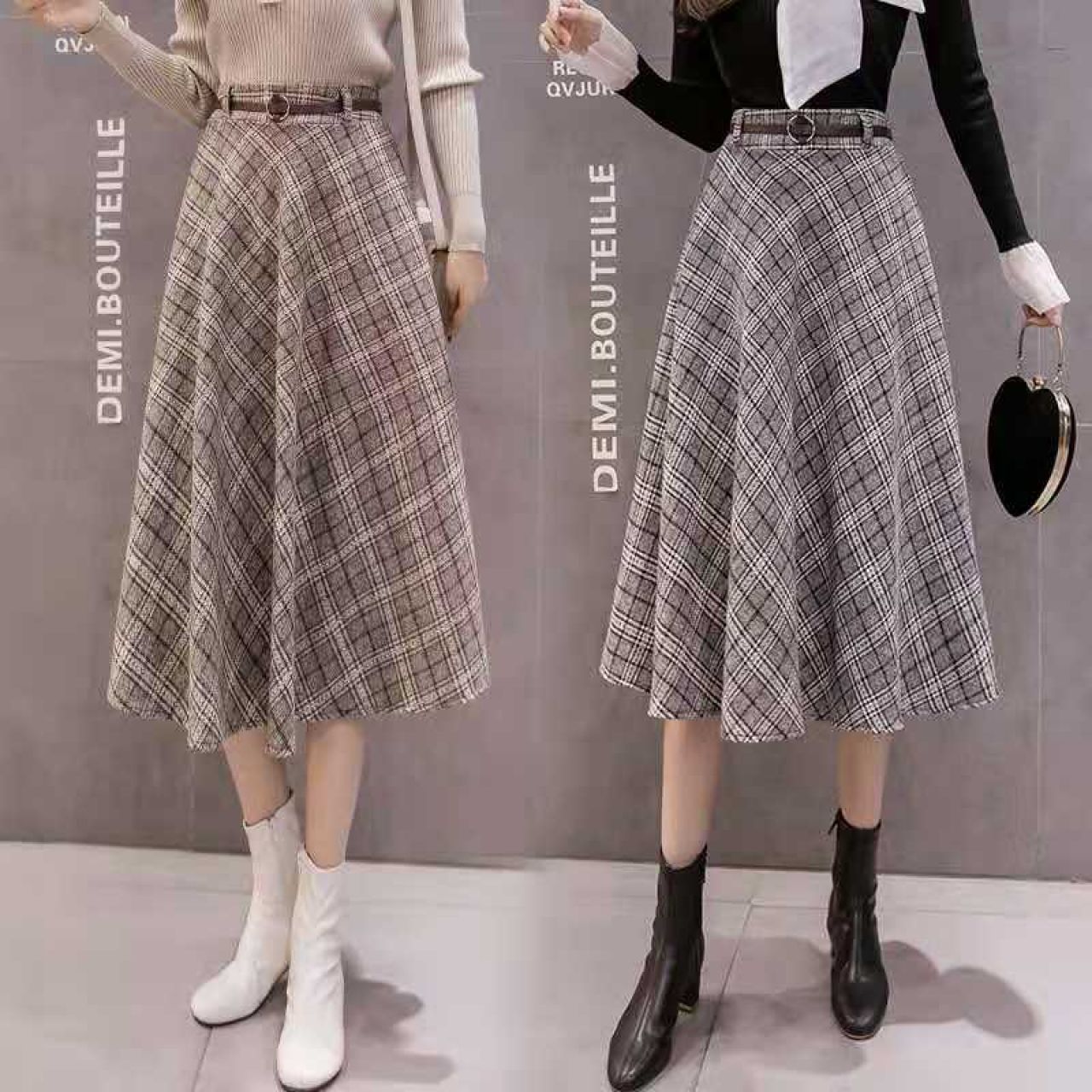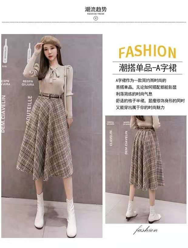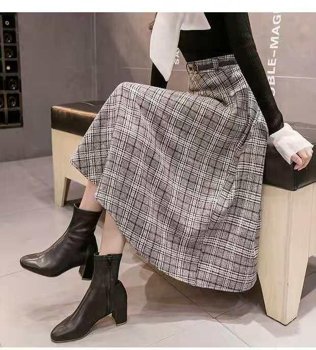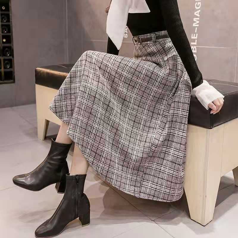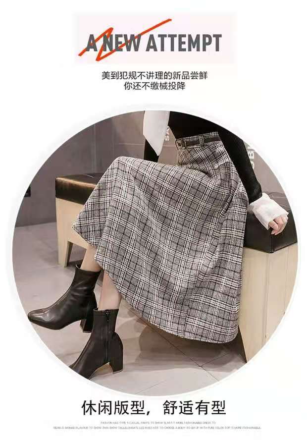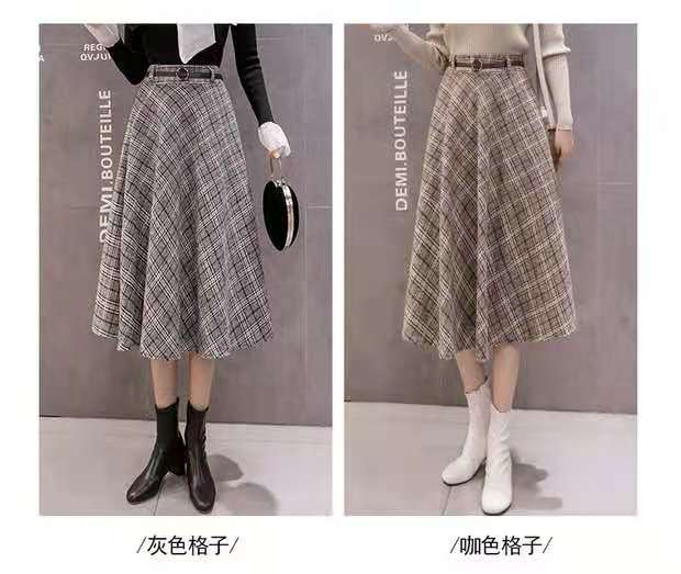 2020新款小个子毛呢格子半身裙A字裙女秋冬季中长款高腰显瘦伞裙