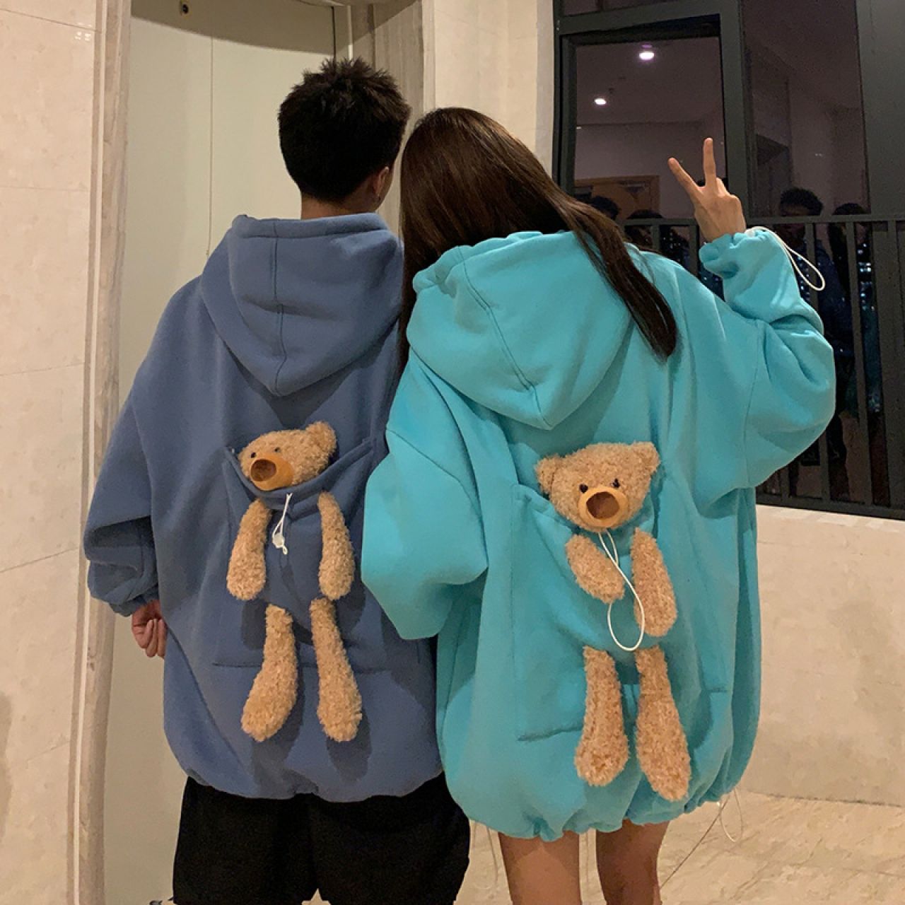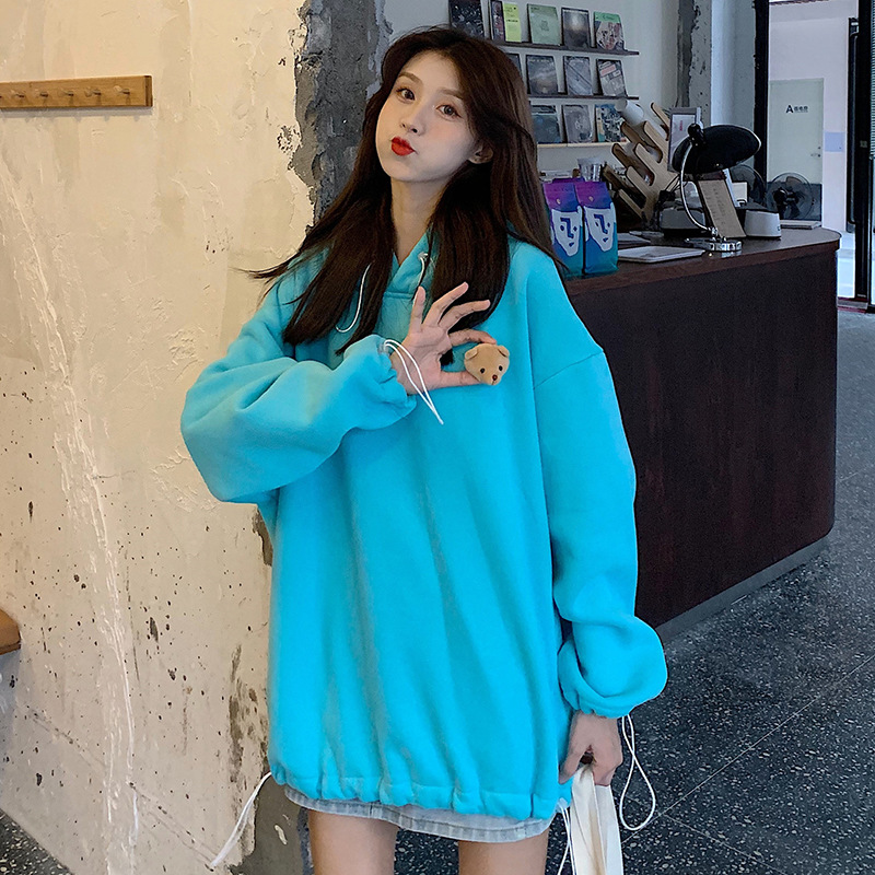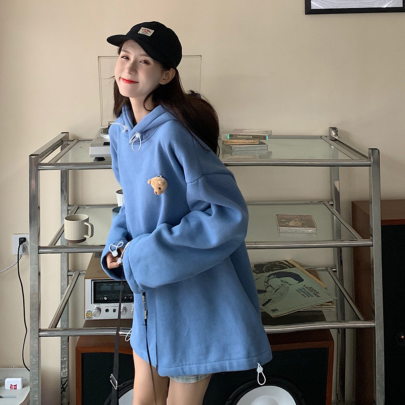 秋冬韩版2020新款情侣闺蜜装加绒加厚宽松中长款小熊长袖卫衣女装