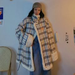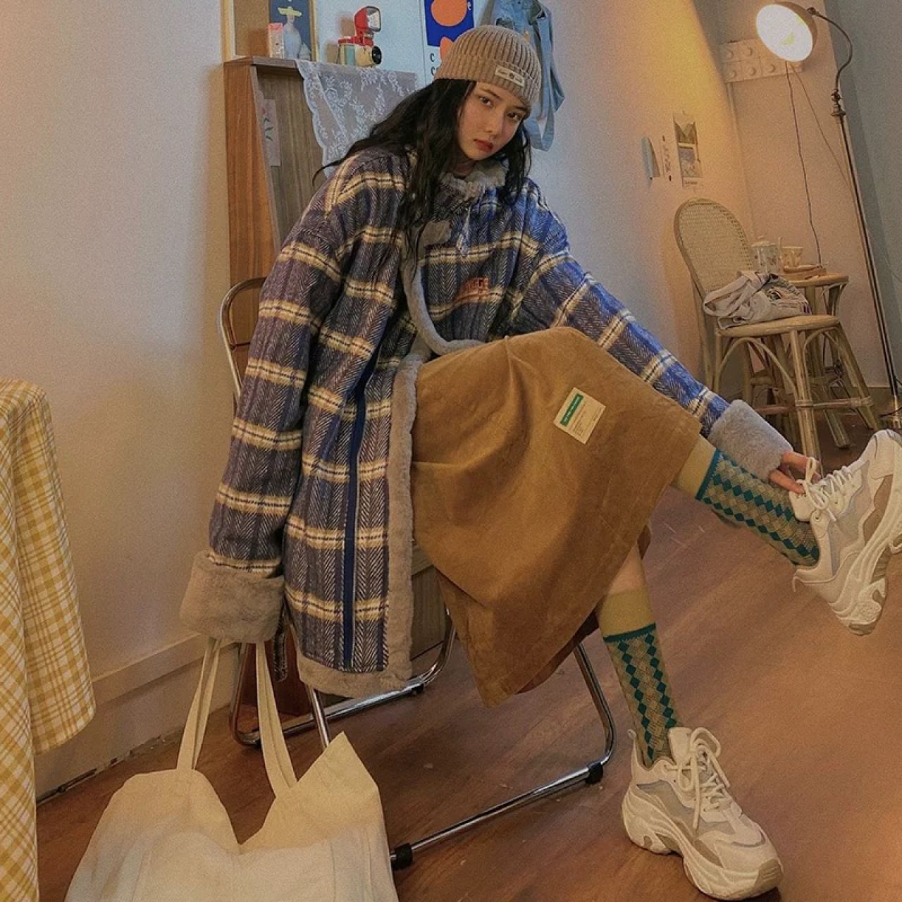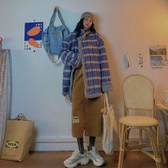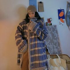 复古棉服高领格子棉衣女2020冬季新款加厚宽松呢子外套 蓝色 S