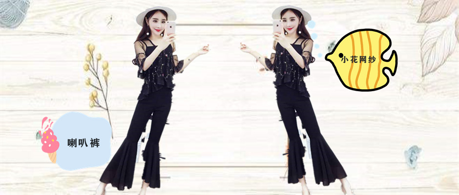蔚缇2017夏季小花网纱+吊带+喇叭裤三件套女