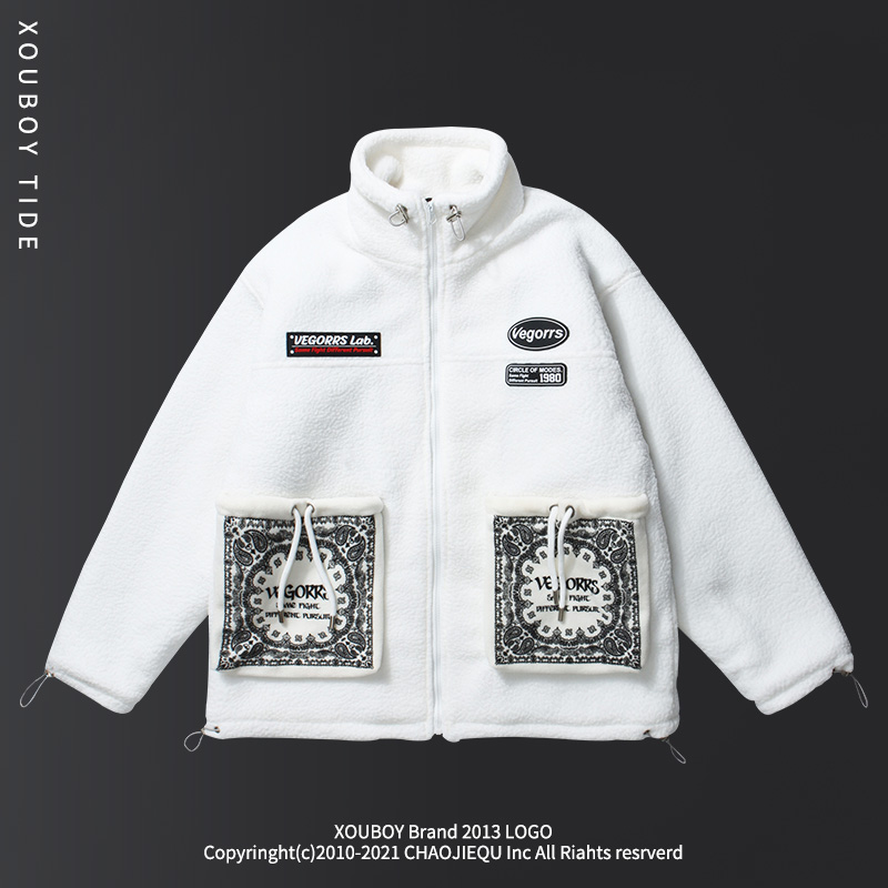 西海岸欧美高街潮牌腰果花贴布潮牌立领高领棉服外套男摇粒绒棉衣