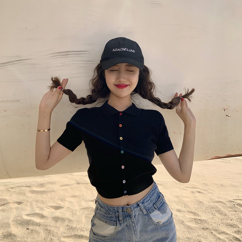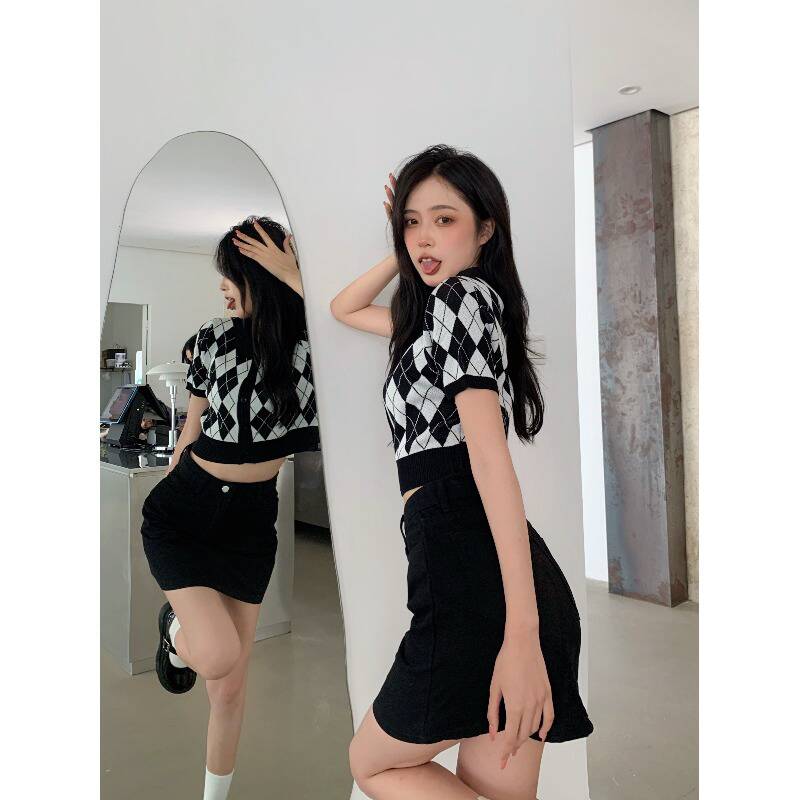 辣妹菱格针织衫女2021年夏季美式复古POLO衫甜辣短款修身短袖上衣