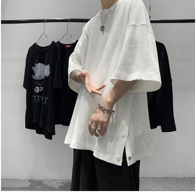 夏季新款排扣短袖T恤男潮牌潮流圆领衣服华夫格宽松
