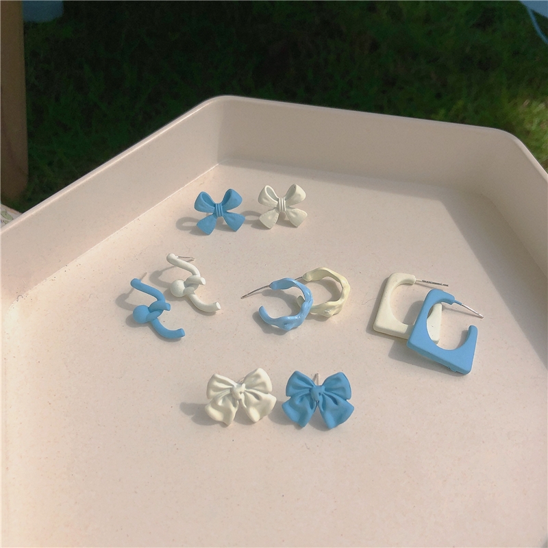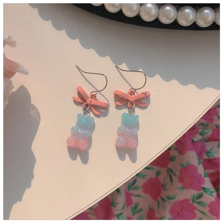 原创款渐变色小熊耳环粉色蓝色软妹日系格子蝴蝶结耳钉耳饰耳夹