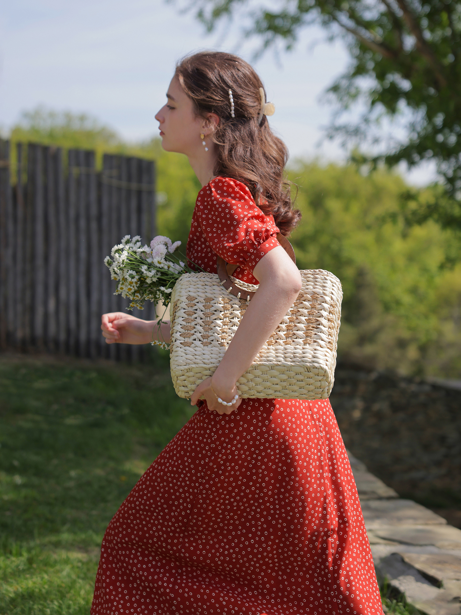复古荷叶边袖方领连衣裙女夏碎花拼接鱼尾裙