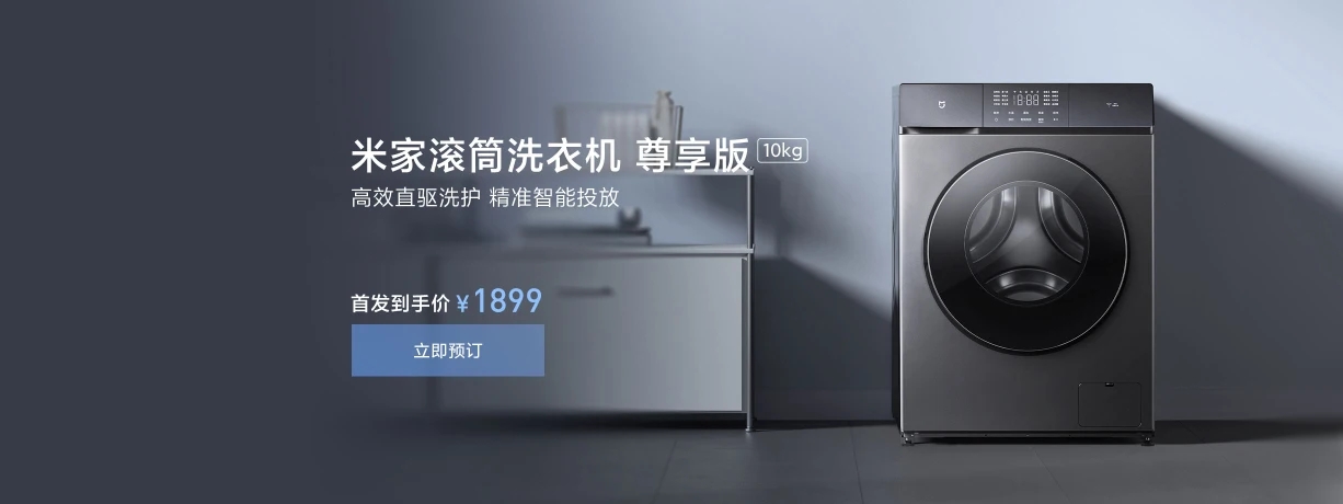 「洗衣机新品上线!预售到手价1899元!付尾款赠米家自动洗手机套装!晒单返米家毛球修剪器0.01元抵扣券!」「直驱变频电机、智能投放洗衣液、99.9%银离子除菌!」