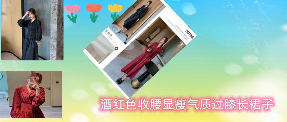 新款女长袖连衣裙衬衫式酒红色收腰显瘦气质过膝长裙子
