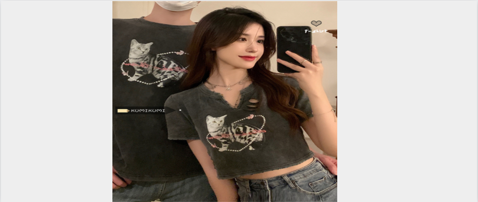 情侣装短袖t恤设计感夏季复古港味猫咪打底衫辣妹短款破洞上衣
