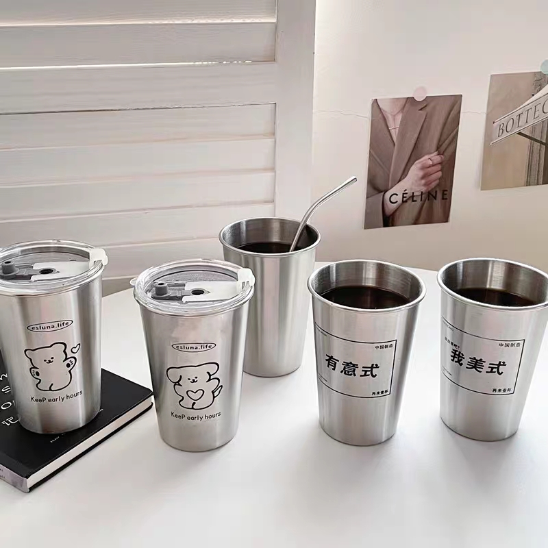 工业风304不锈钢吸管杯 ins 防摔带盖杯子随手杯咖啡杯家用冷饮杯