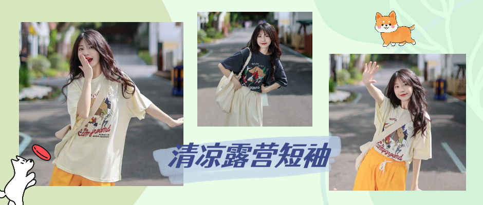 艺野系露营大印花奶杏色短袖t恤,女夏大版宽松美式复古学院上衣。清凉夏季帮你找到属于你的那一份清爽。