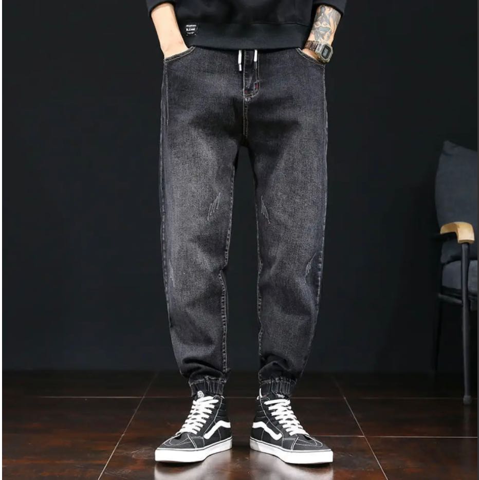 海澜优选春秋大码牛仔裤男韩版潮流百搭松紧腰裤子宽松常规休闲束脚哈伦裤 黑色_(8806常规) L_(115-135斤可穿)