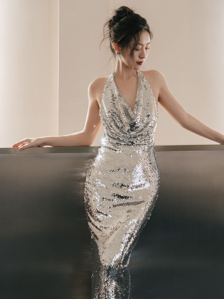 blingbling亮挂脖连衣裙女高级感鱼尾长裙露背生日party礼服闪闪