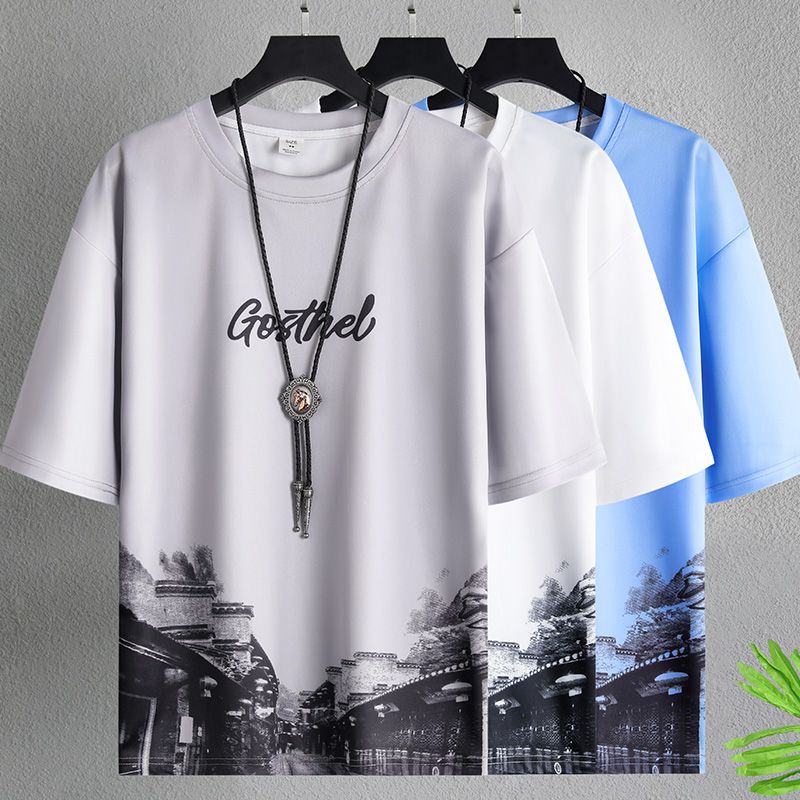 夏季男士短袖T恤套装冰丝男t恤百搭宽松国潮上衣潮流新款潮牌T恤