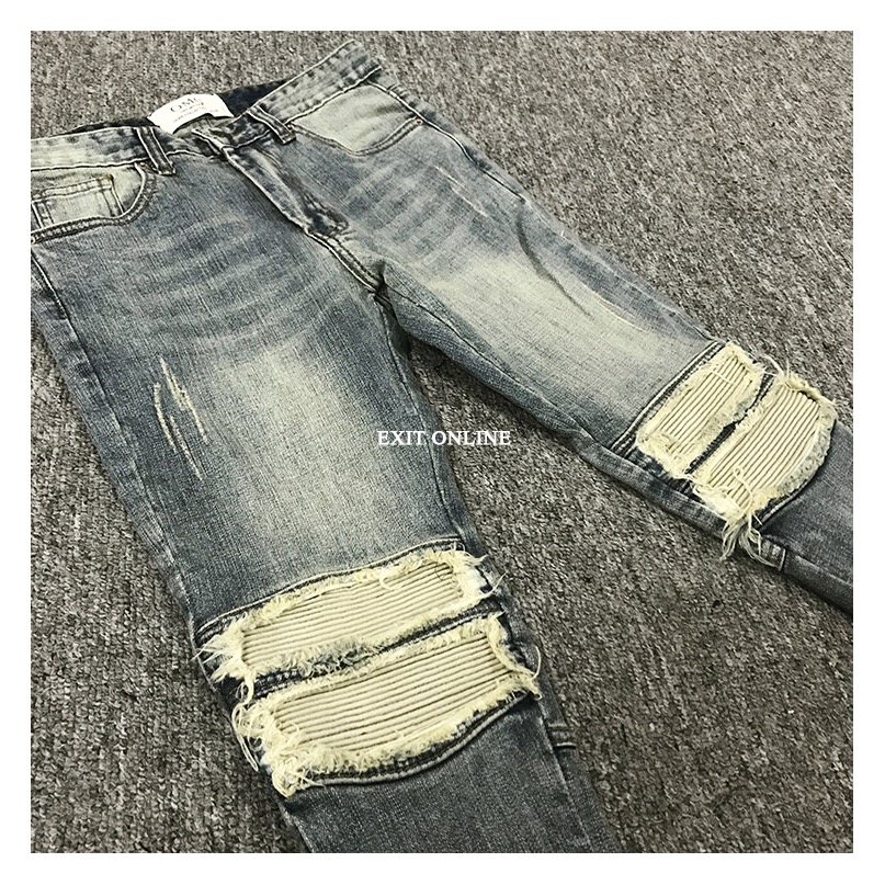 新款欧美高街潮牌怀旧复古水洗弹力修身小脚拼接机车浅蓝牛仔裤男