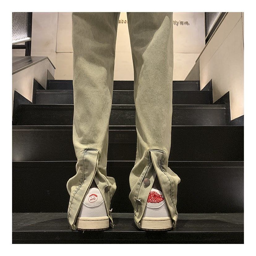 纽扣开叉黄泥染牛仔裤男春秋季美式复古修身小脚微喇裤子休闲长裤