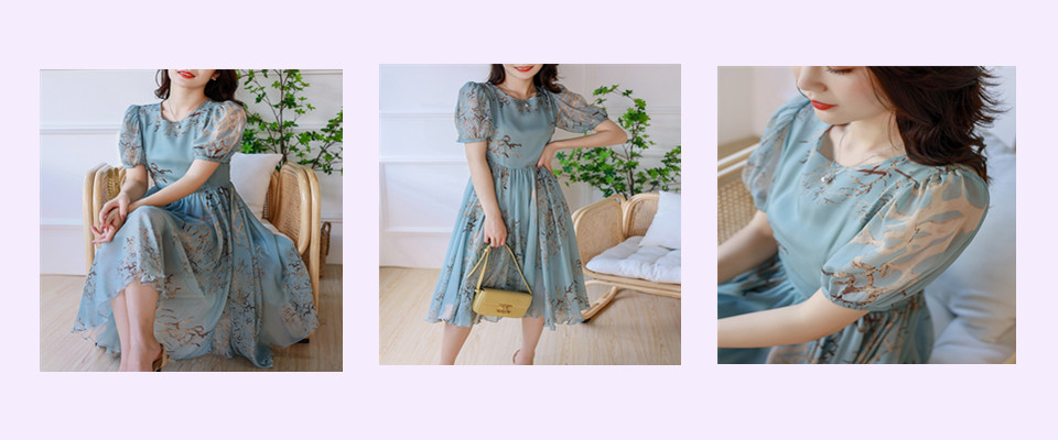 s4,玉米高端2021年夏季浪漫蓝色桑蚕丝乔其收腰大摆灯笼袖真丝连衣裙
