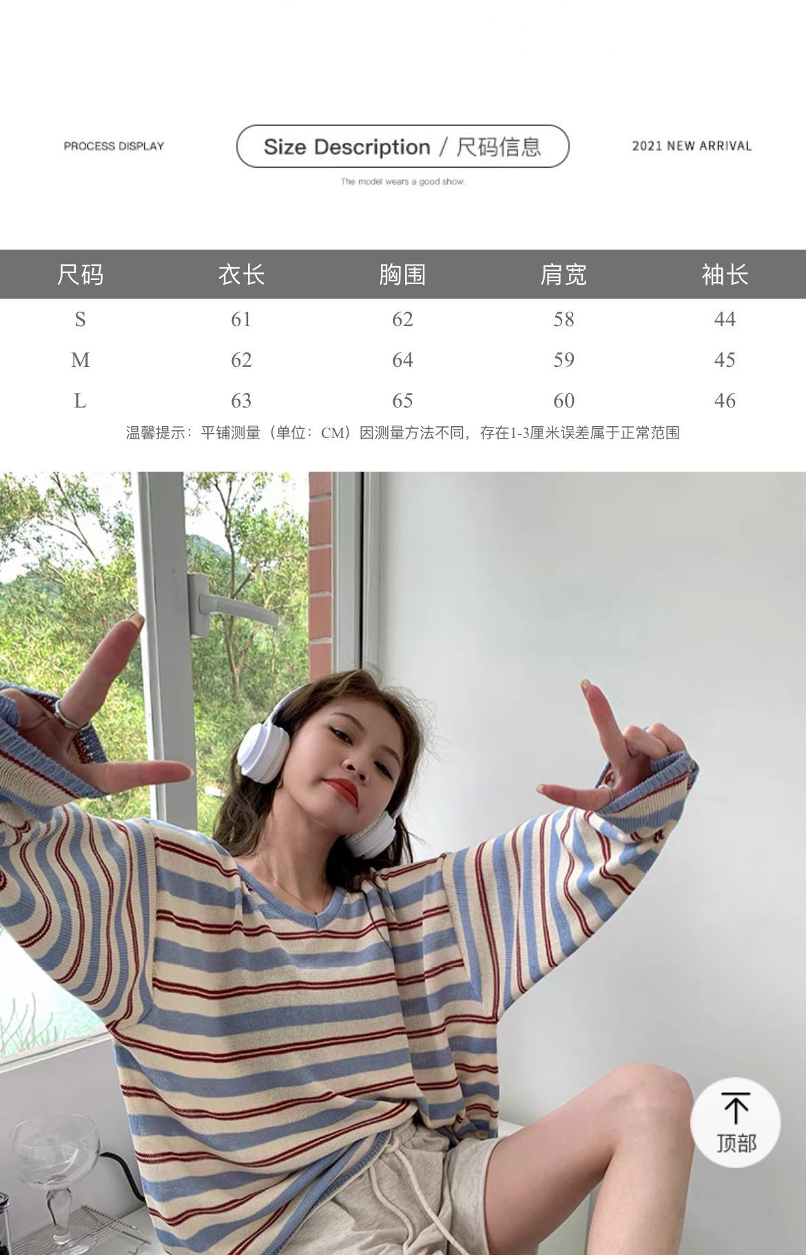 条纹长袖T恤女ins潮早秋季设计感小众v领宽松显瘦针织打底衫上衣