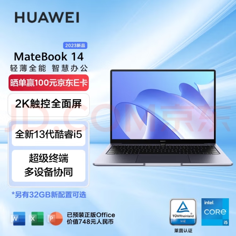 华为笔记本电脑MateBook 14 2023 13代酷睿版 i5 16G 1T 14英寸轻薄办公本/2K触控全面屏/手机互联 深空灰
