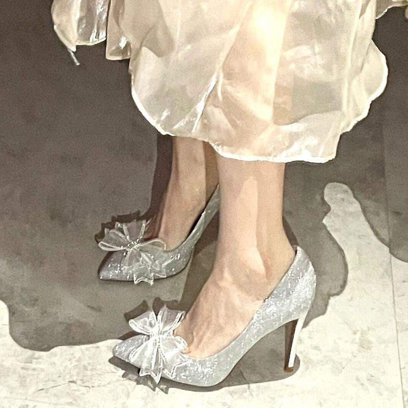 法式水晶鞋2023春秋新款银色婚鞋水钻蝴蝶结尖头高跟鞋女细跟单鞋