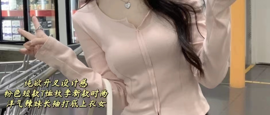 纯欲开叉设计感粉色短款T恤秋季新款时尚洋气辣妹长袖打底上衣女